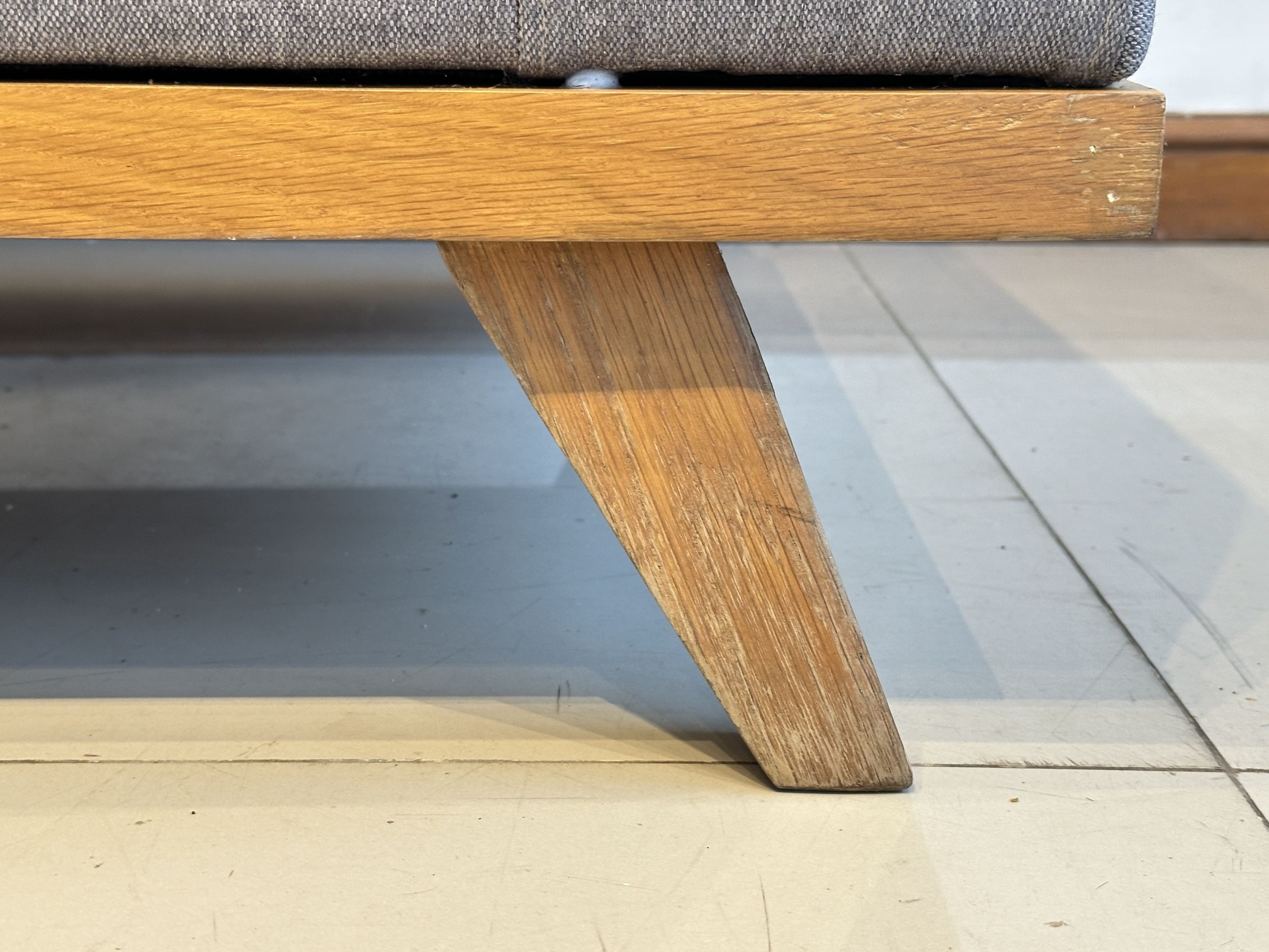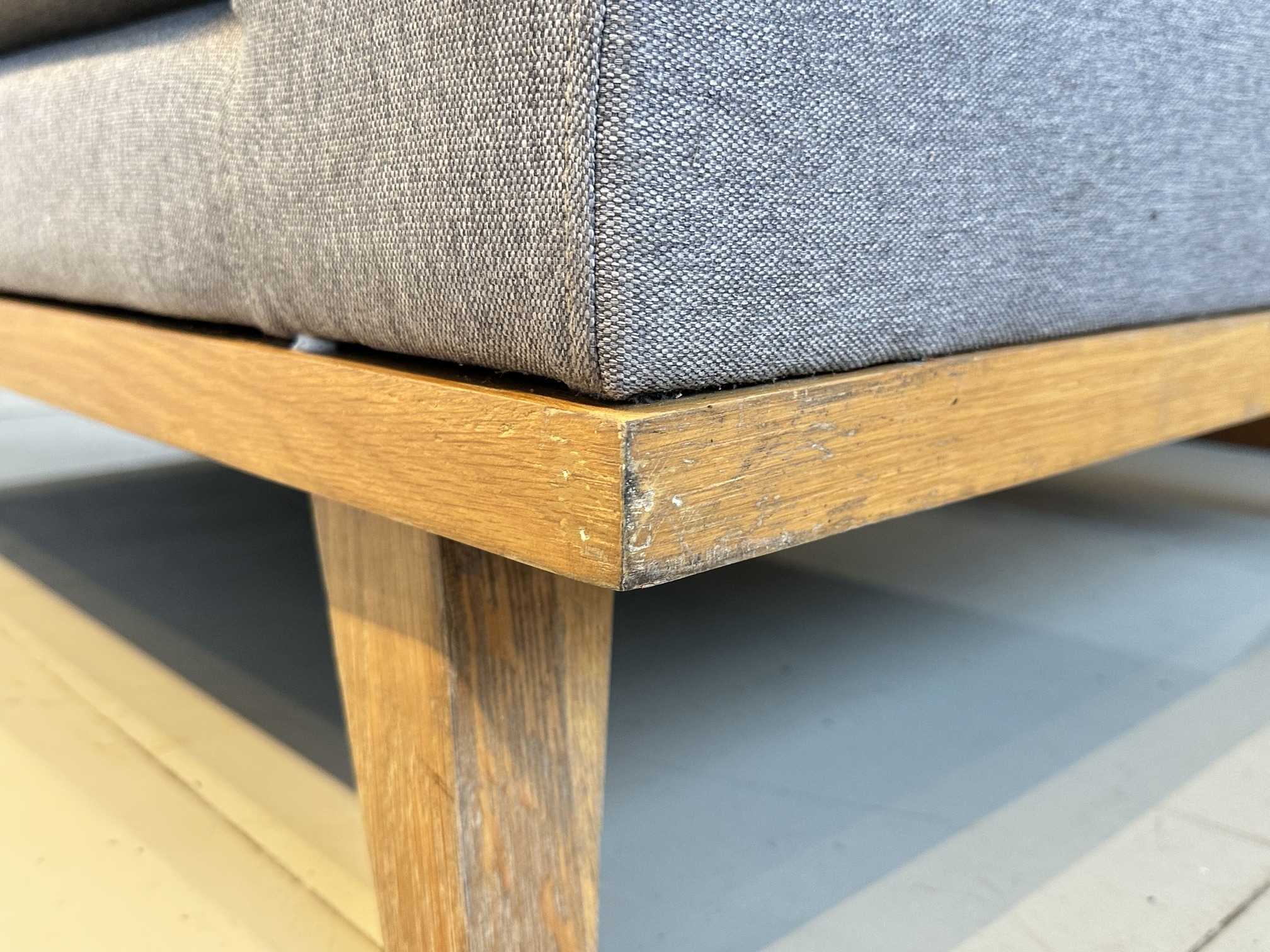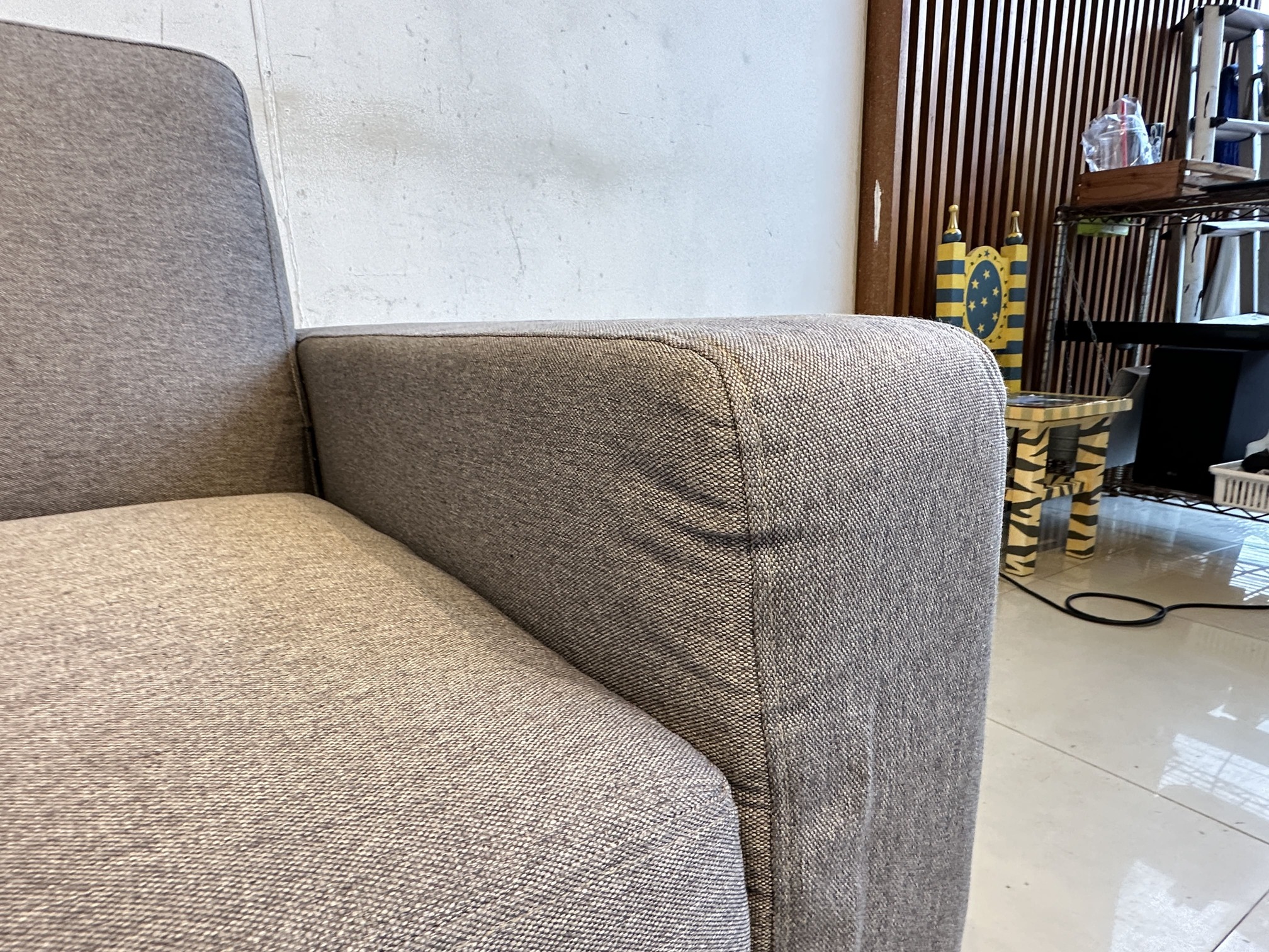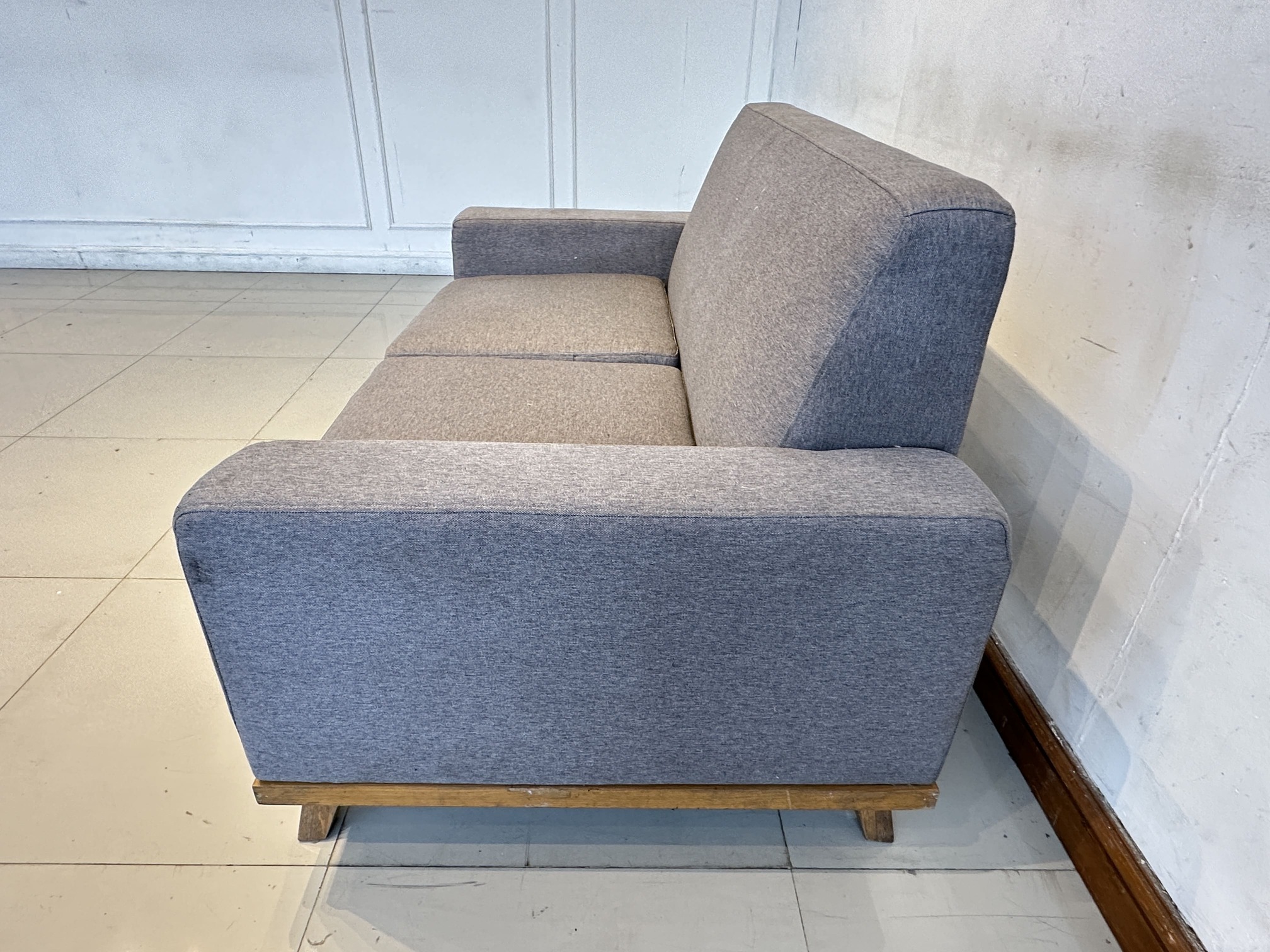โซฟา 2 ที่นั่ง เบาะผ้าสีเทาเข้ม ถอดปลอกได้ โครงขาไม้สน