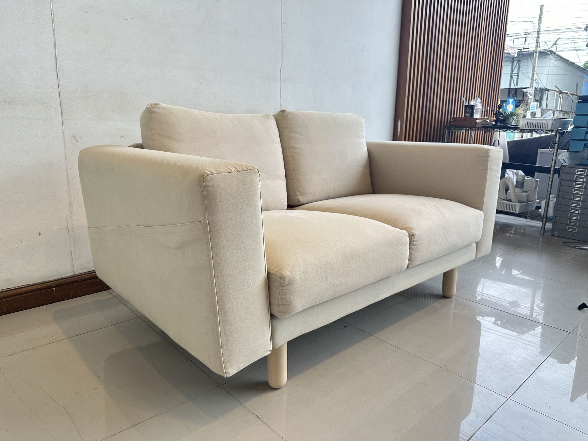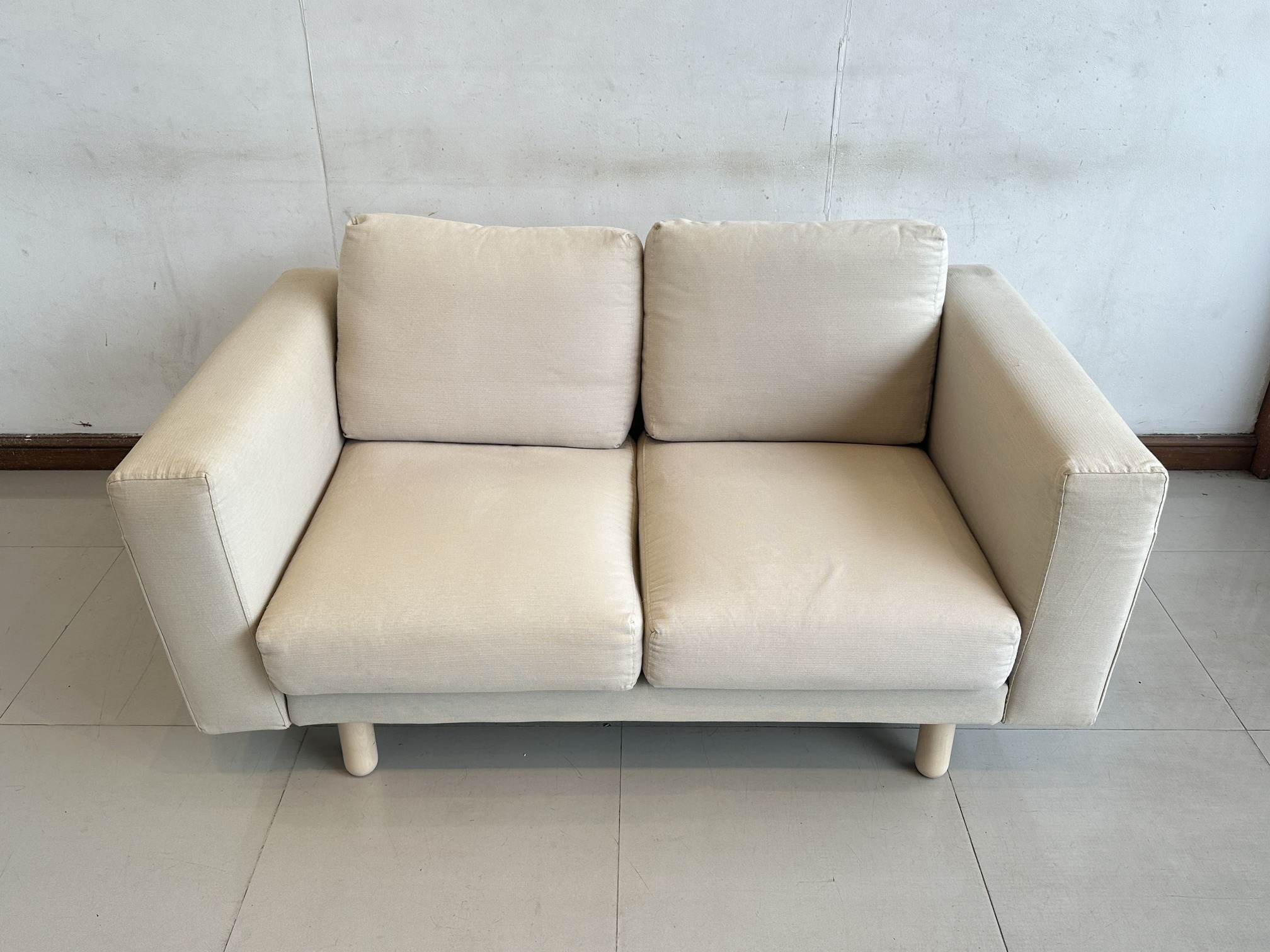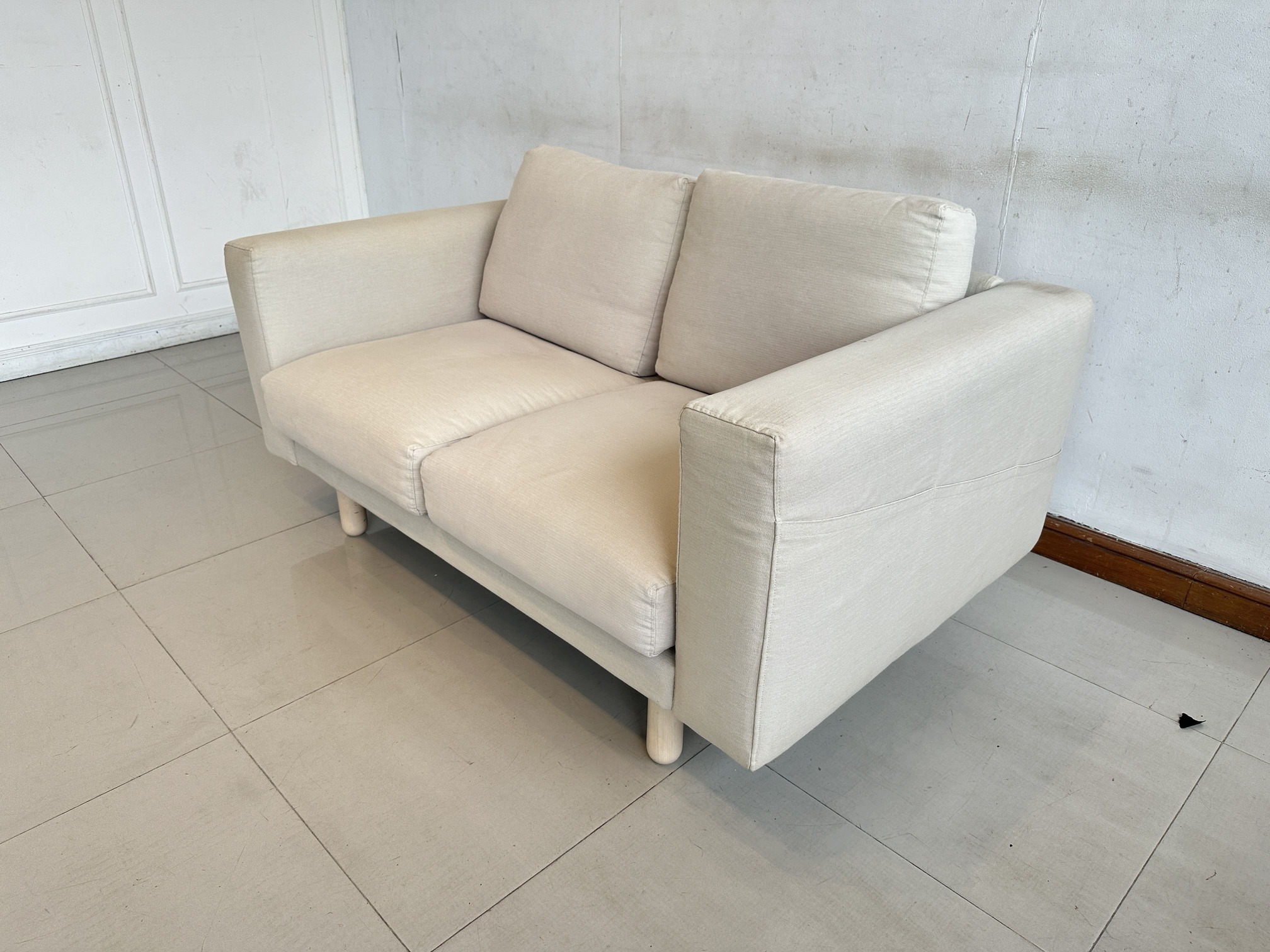 โซฟา 2 ที่นั่ง แบรนด์ IKEA รุ่น NORSBORG เบาะผ้าสีน้ำตาลอ่อน ถอดปลอกได้ ขาไม้สน คานกลางเหล็ก