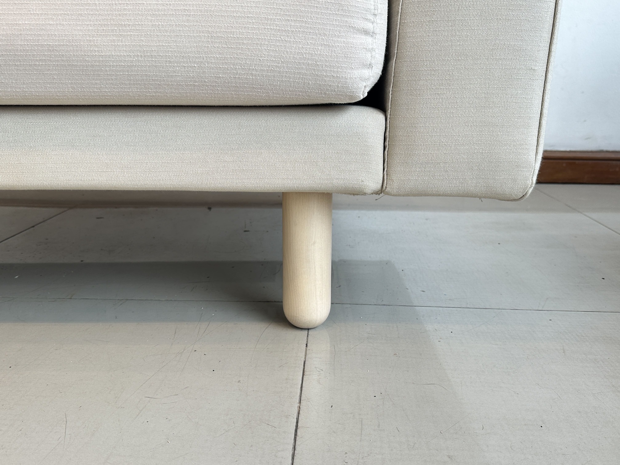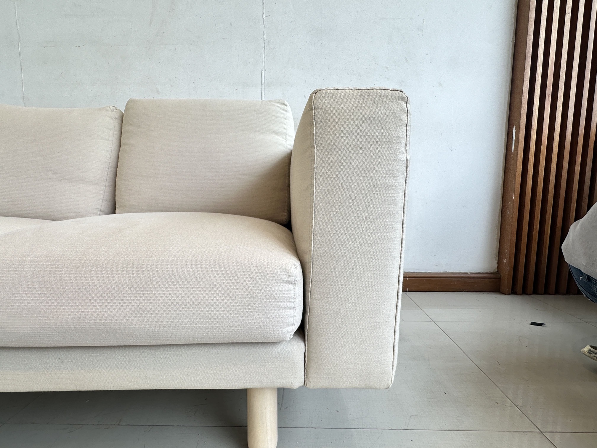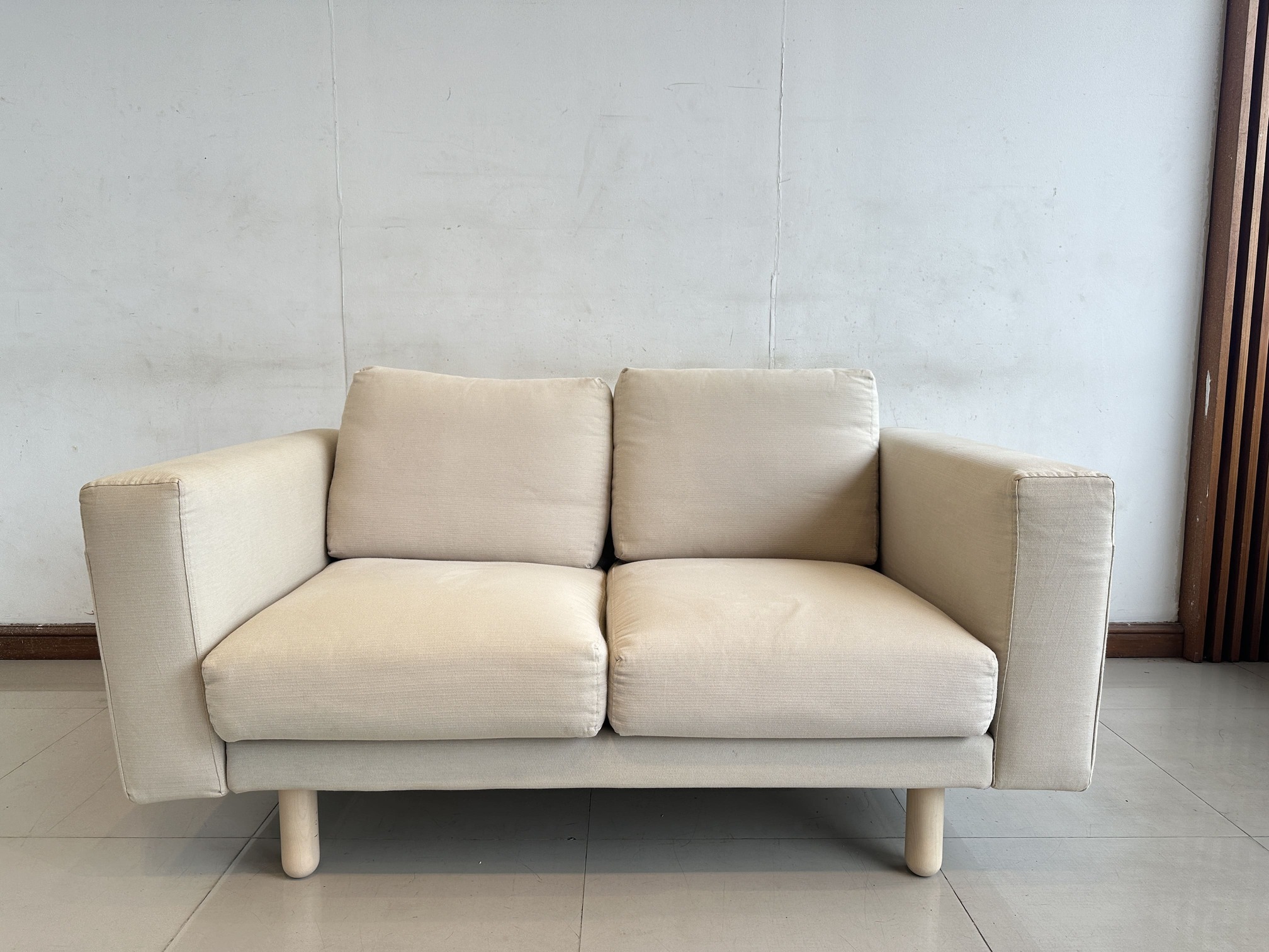 โซฟา 2 ที่นั่ง แบรนด์ IKEA รุ่น NORSBORG เบาะผ้าสีน้ำตาลอ่อน ถอดปลอกได้ ขาไม้สน คานกลางเหล็ก