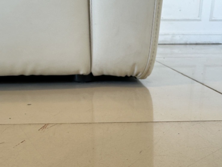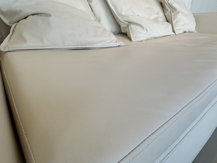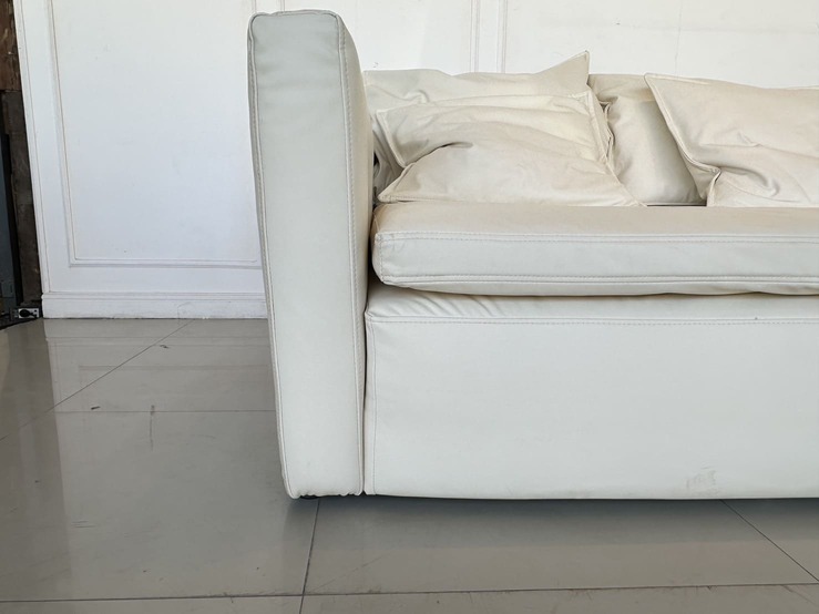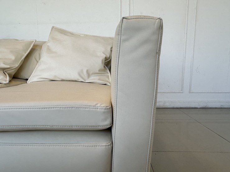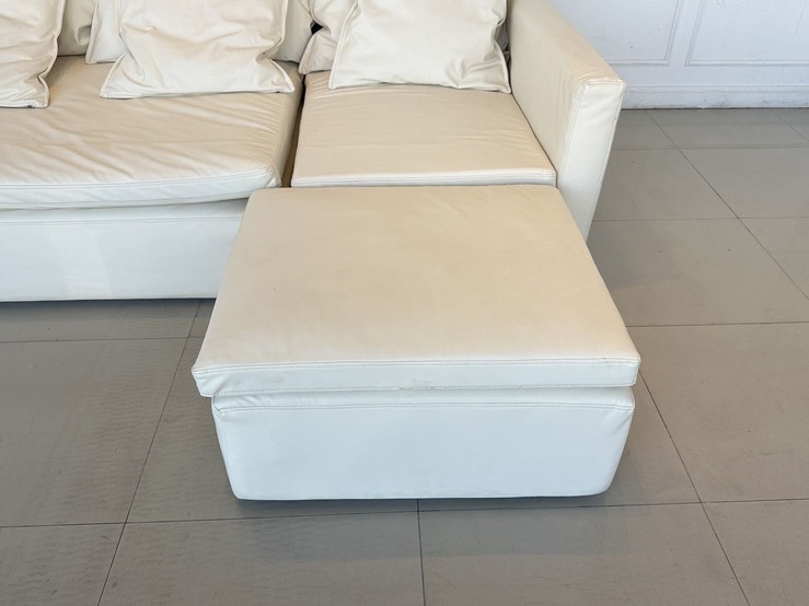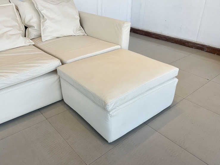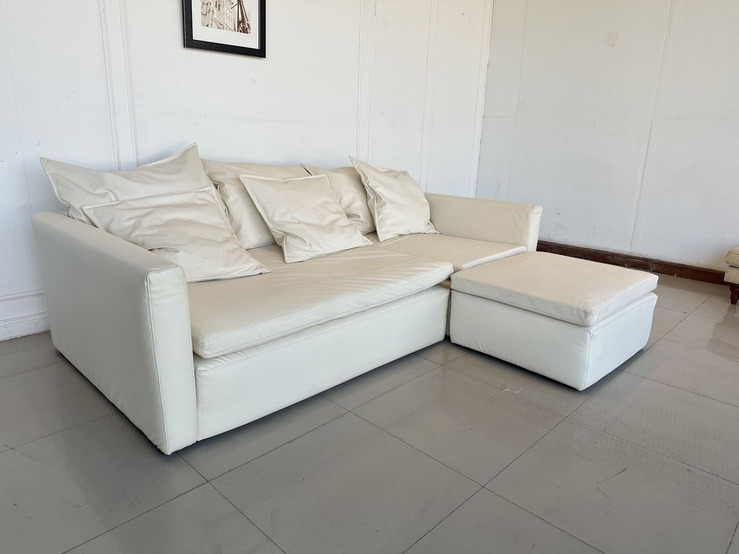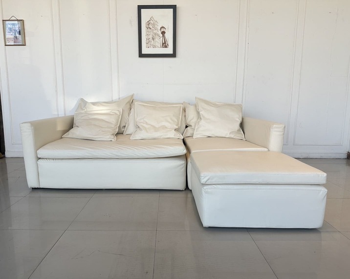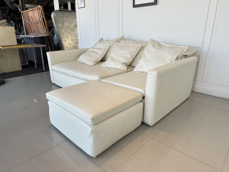 โซฟา 3 ที่นั่ง พร้อมสตูล เบาะหนัง PU สีครีม ถอดปลอกได้ โครงไม้จริง ขาพลาสติกสีดำ