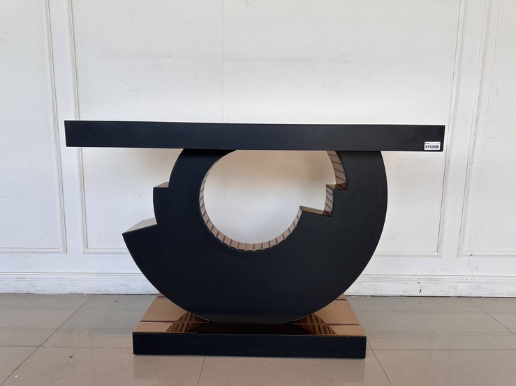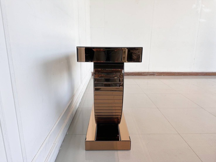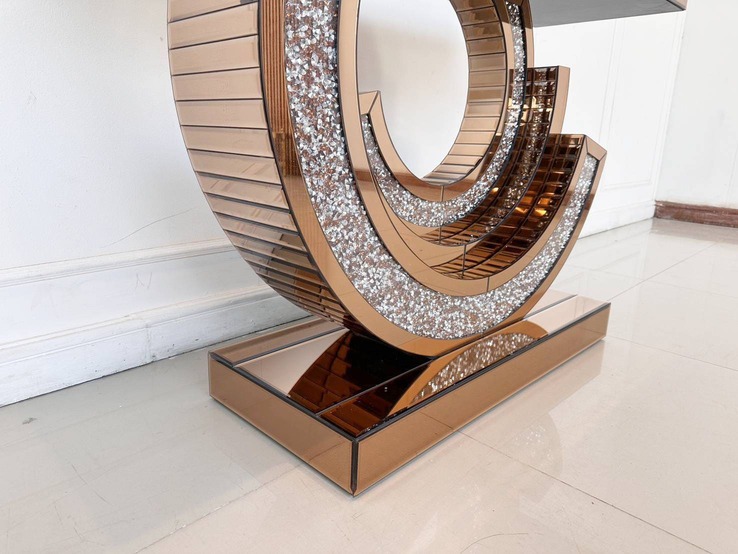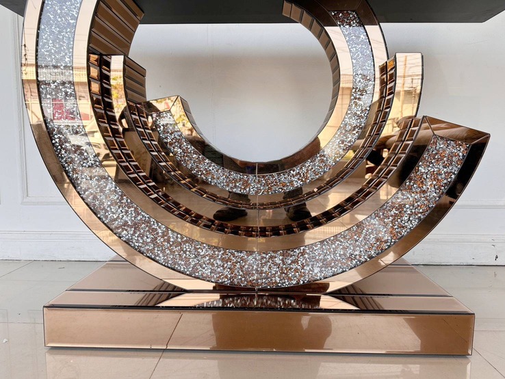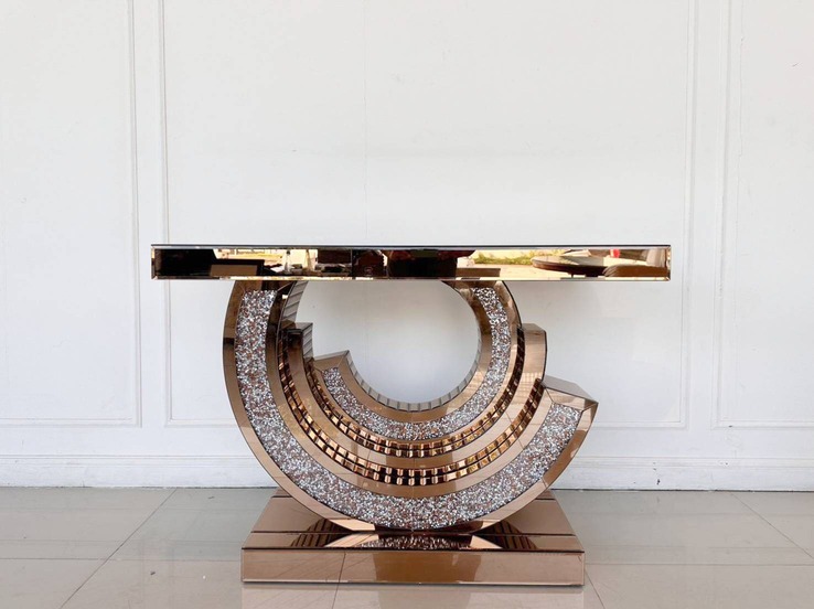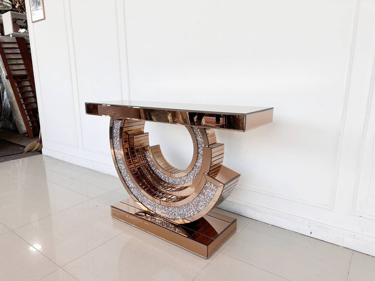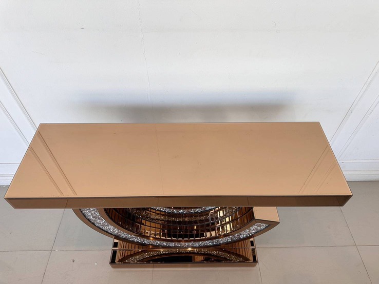 โต๊ะคอนโซล ท็อปกระจกสีโรสโกลด์ ประดับกระจกและคริสตัลรอบๆ โครงไม้ (สภาพใหม่)