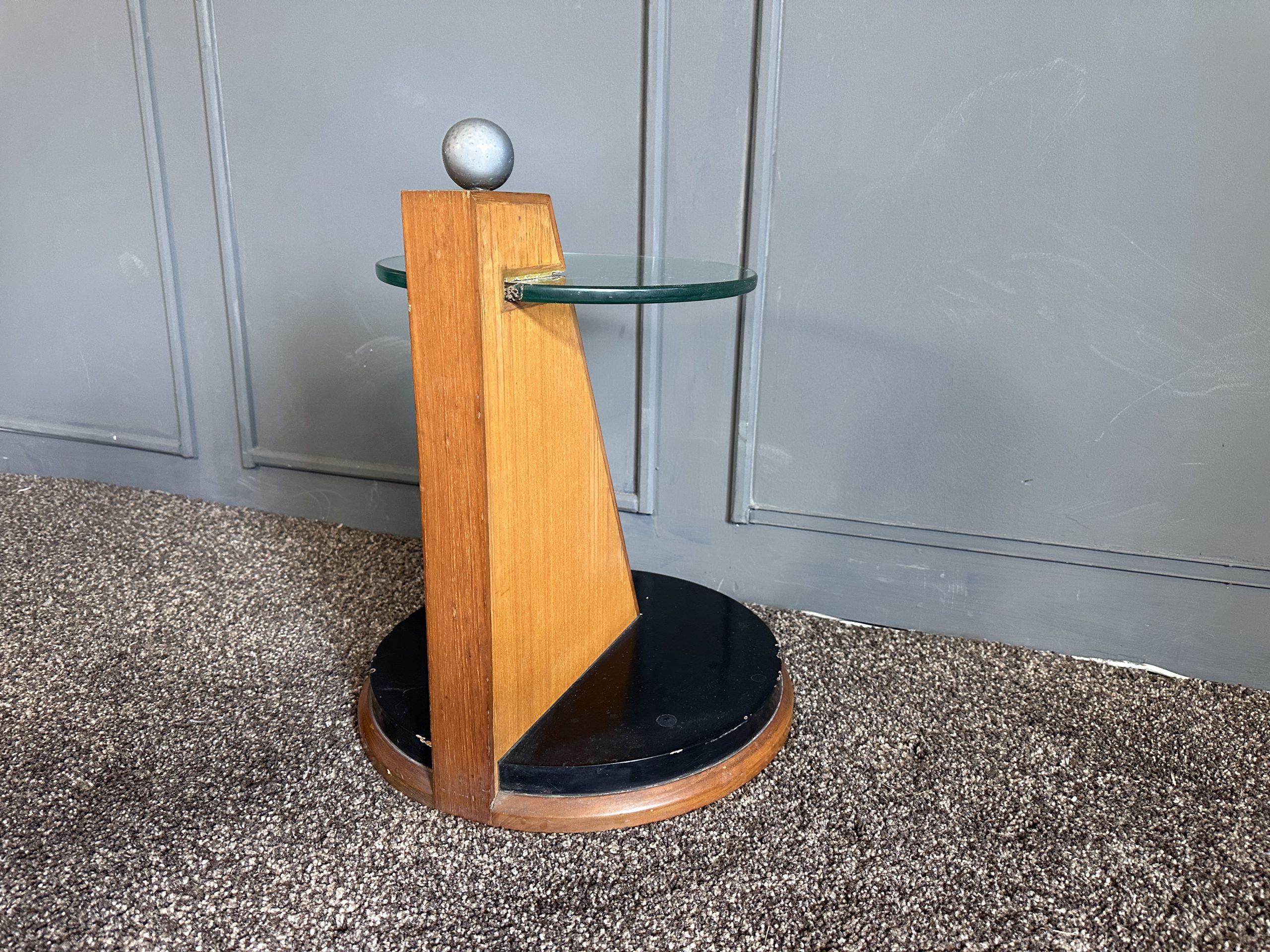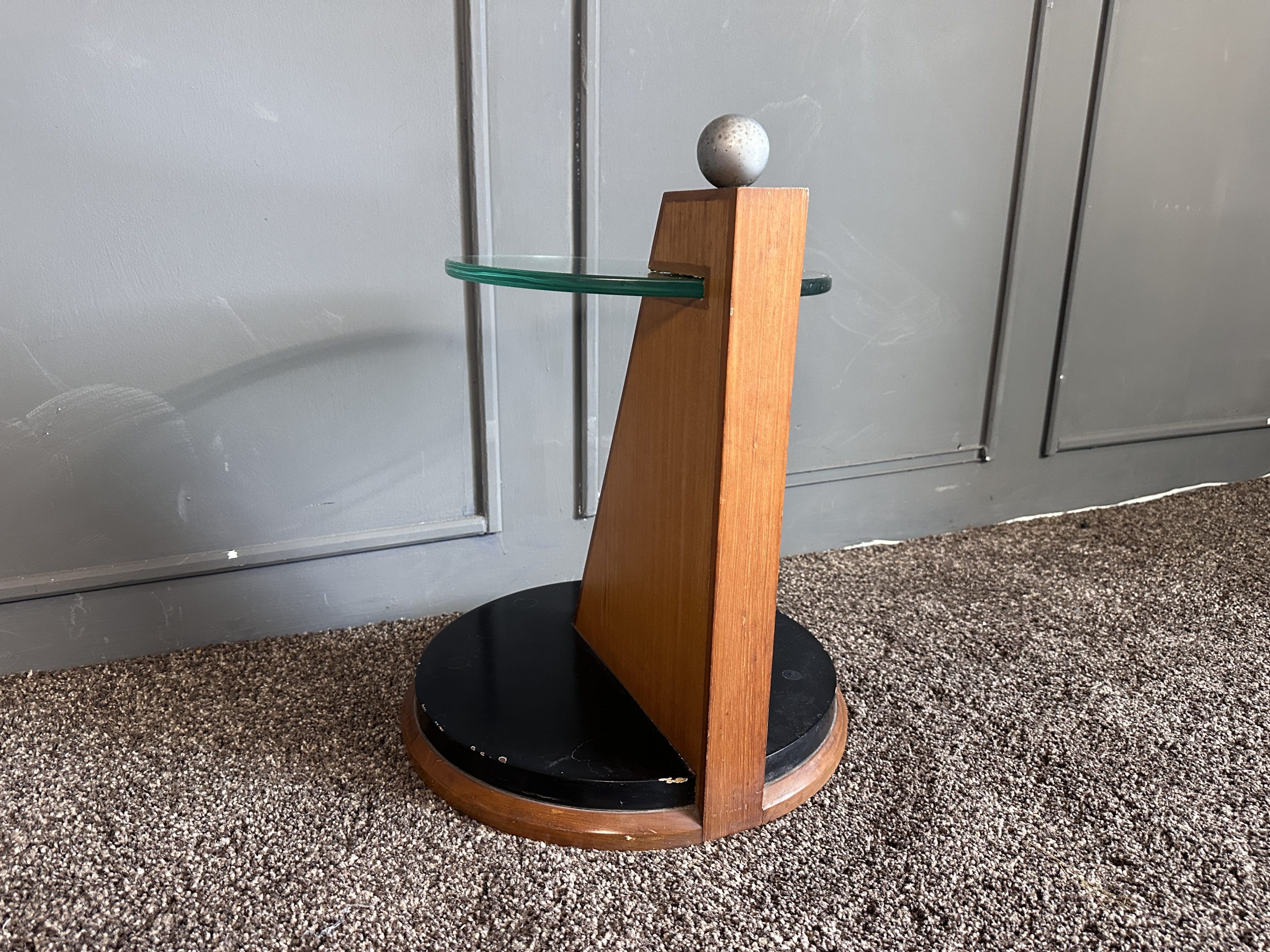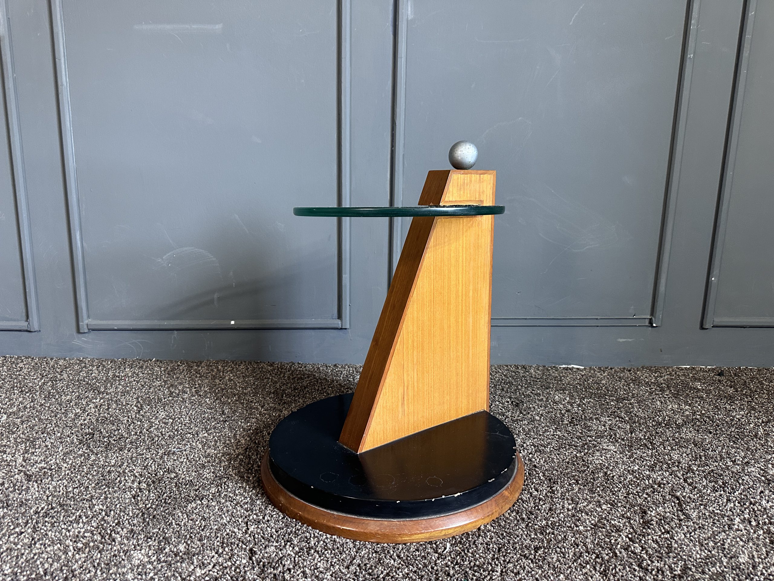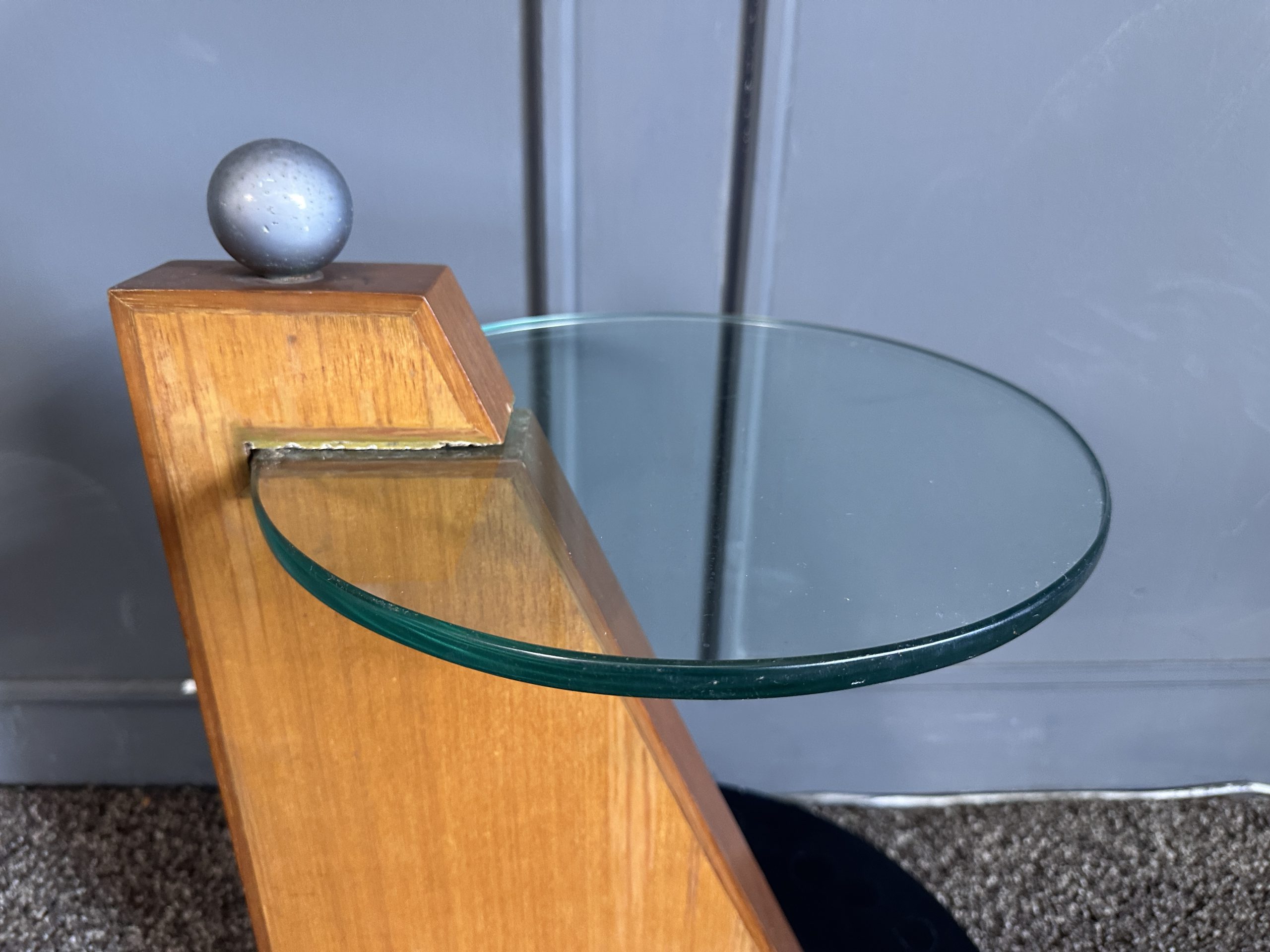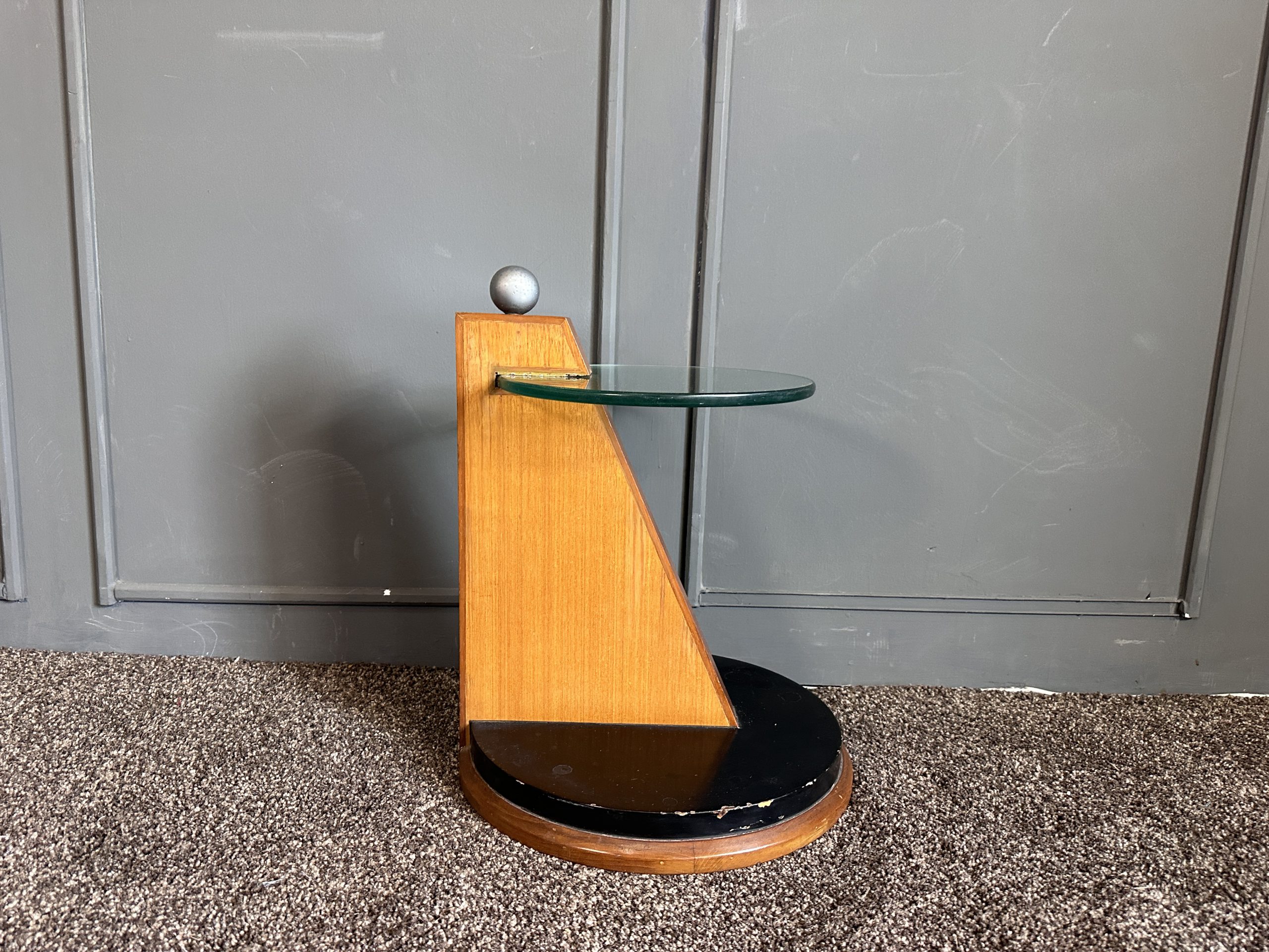 โต๊ะคอฟฟี่เทเบิ้ล ท็อปกระจกกลม โครงขาไม้จริง แปะแผ่นไม้