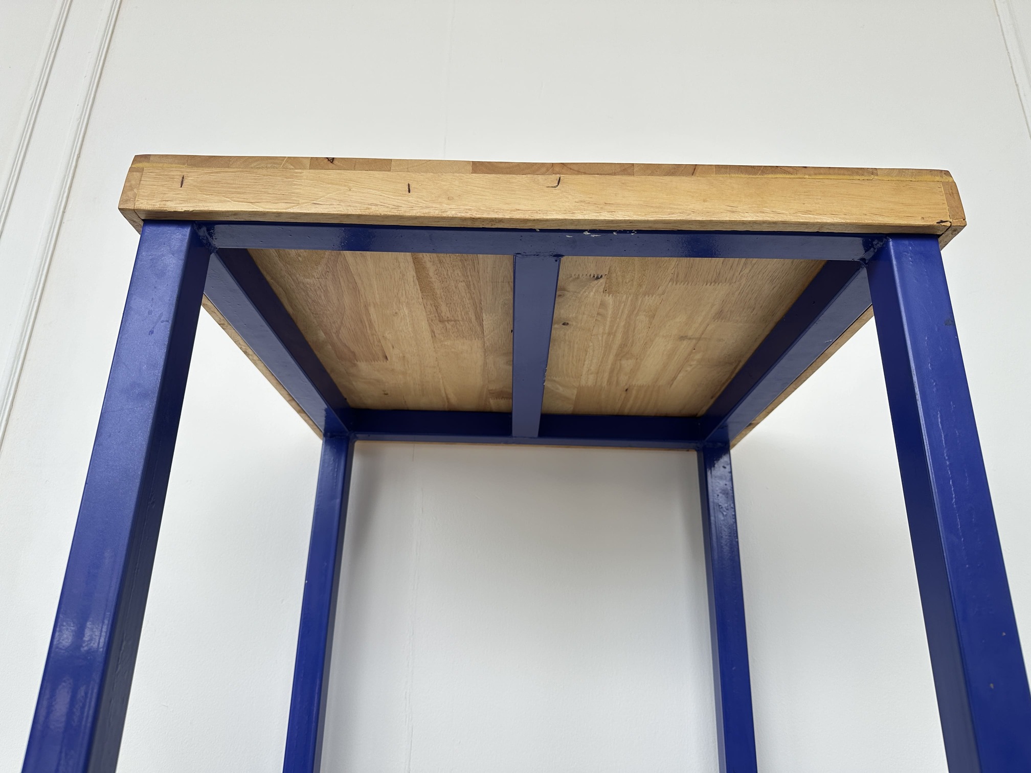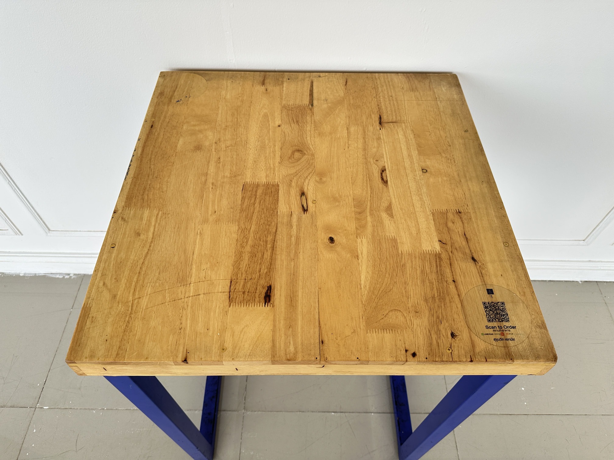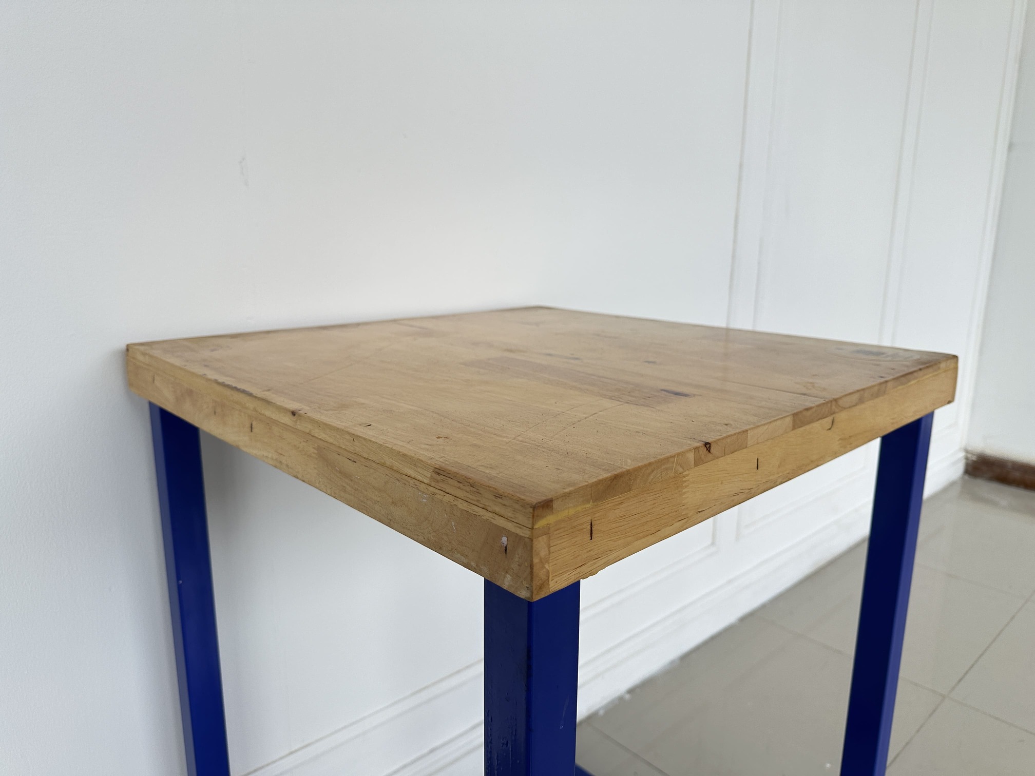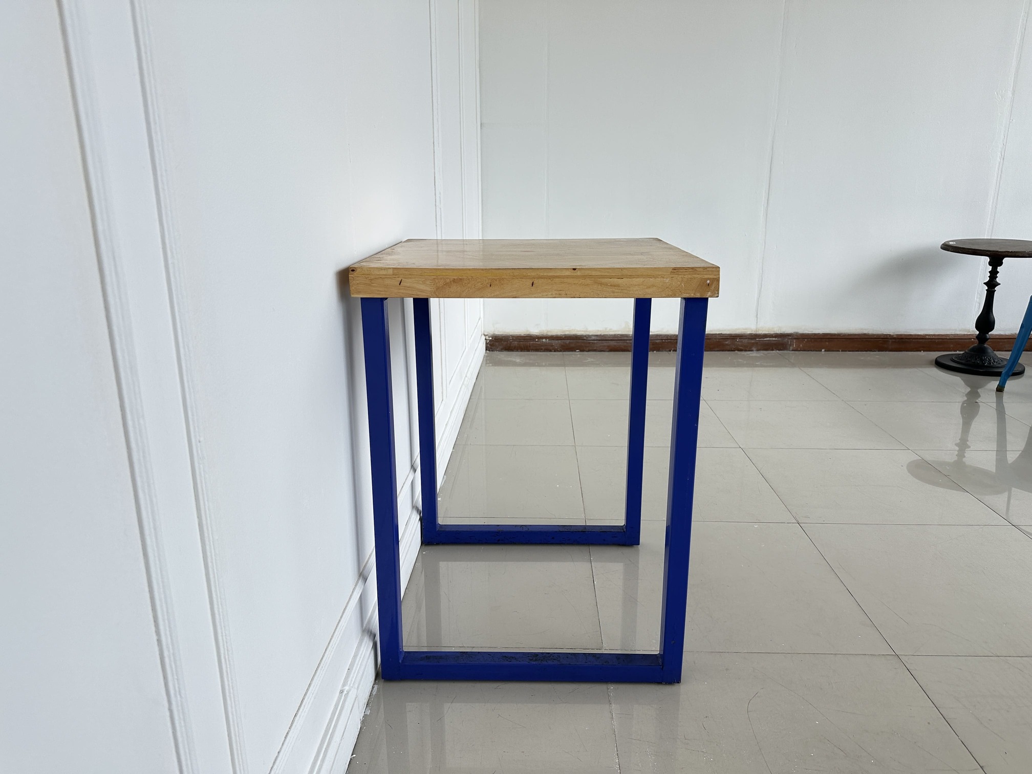 โต๊ะทานอาหาร ท็อปไม้สนประสาน โครงขาเหล็กสีน้ำเงิน