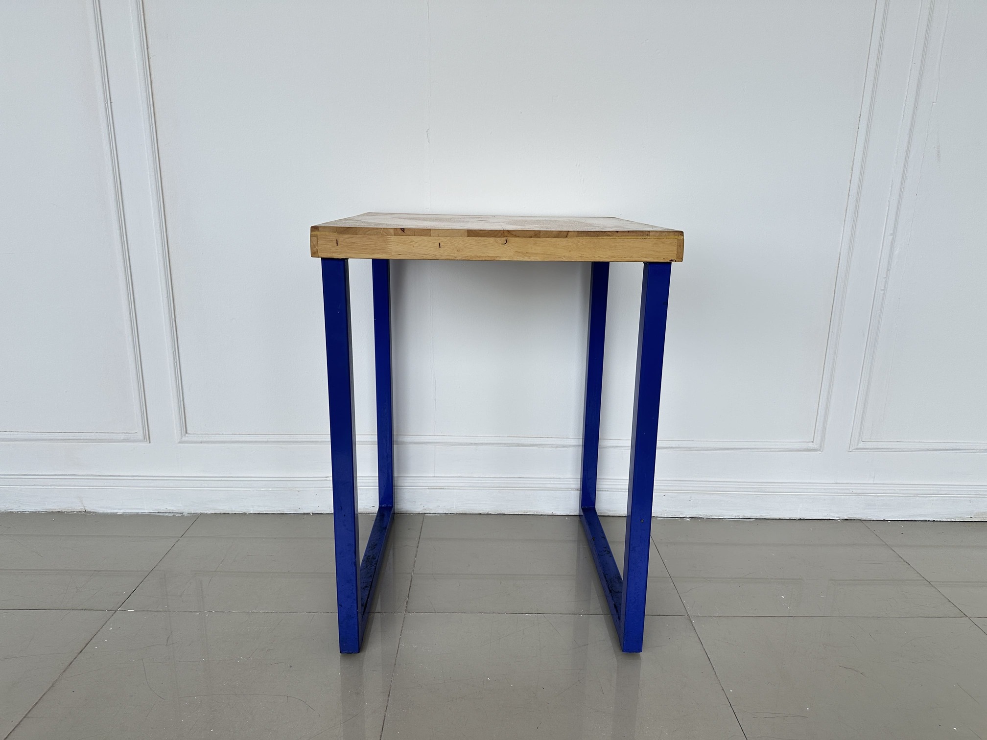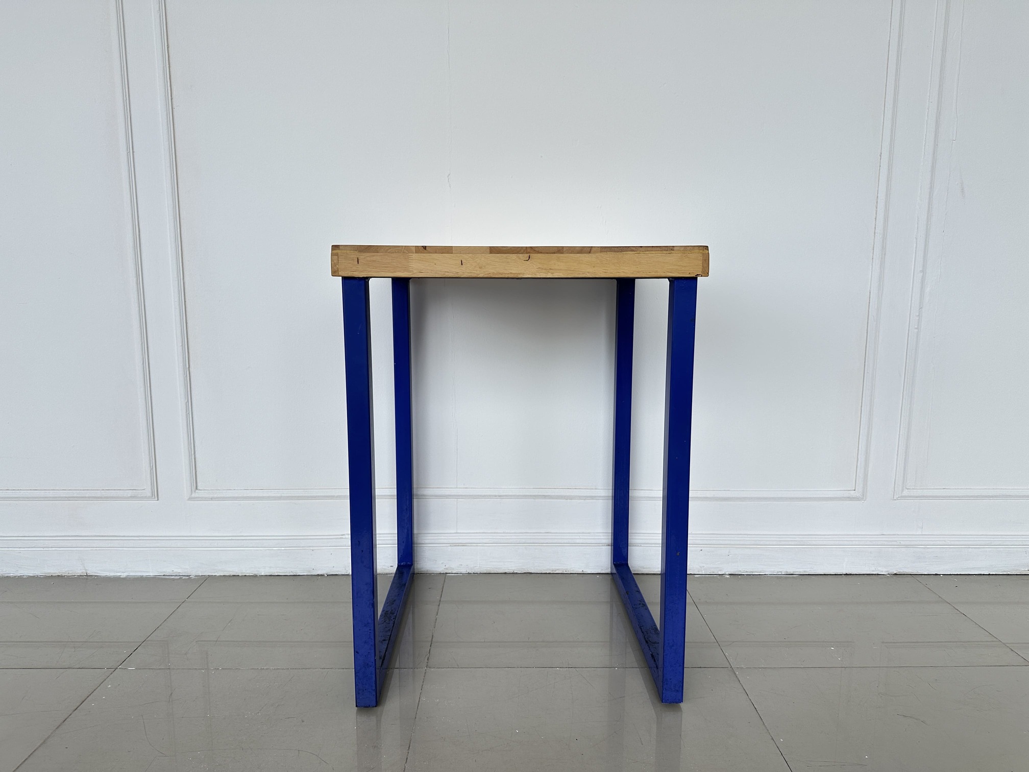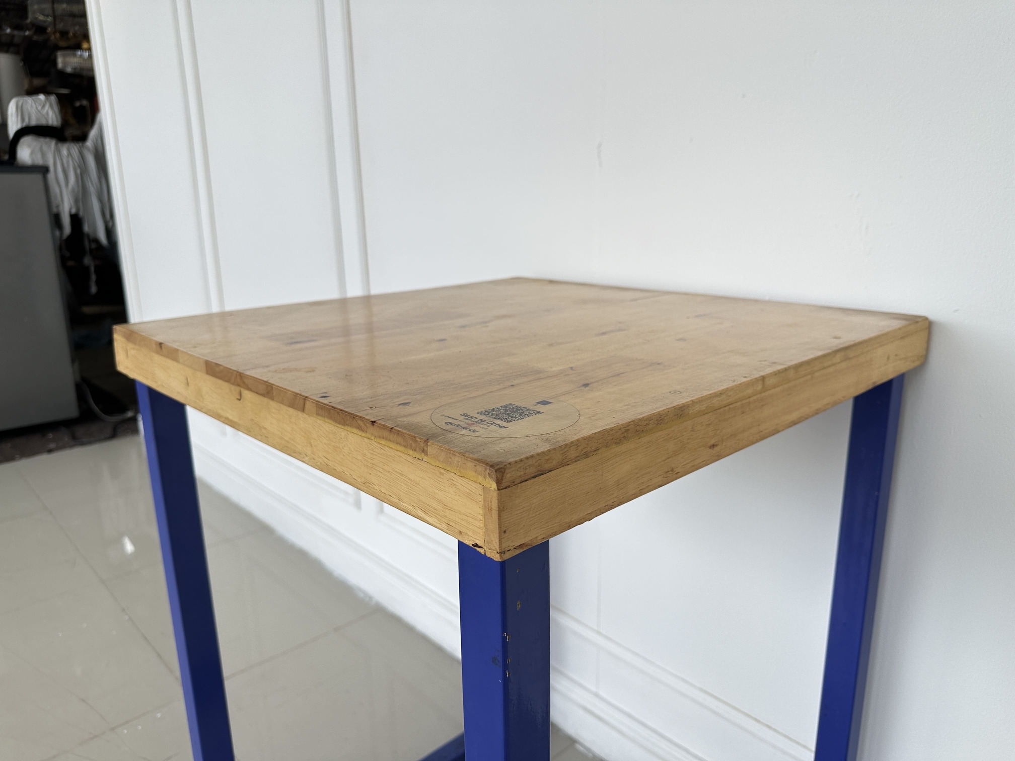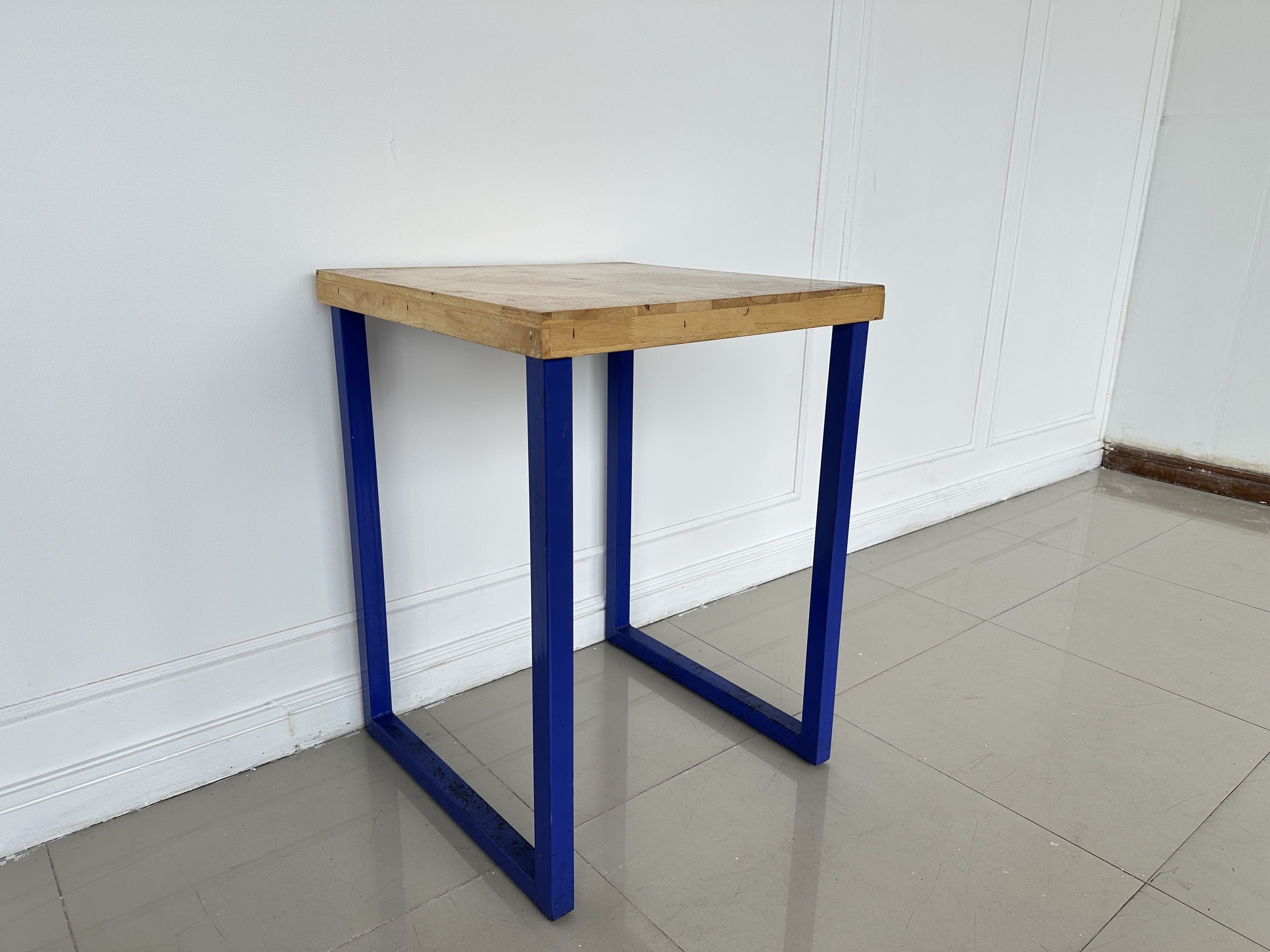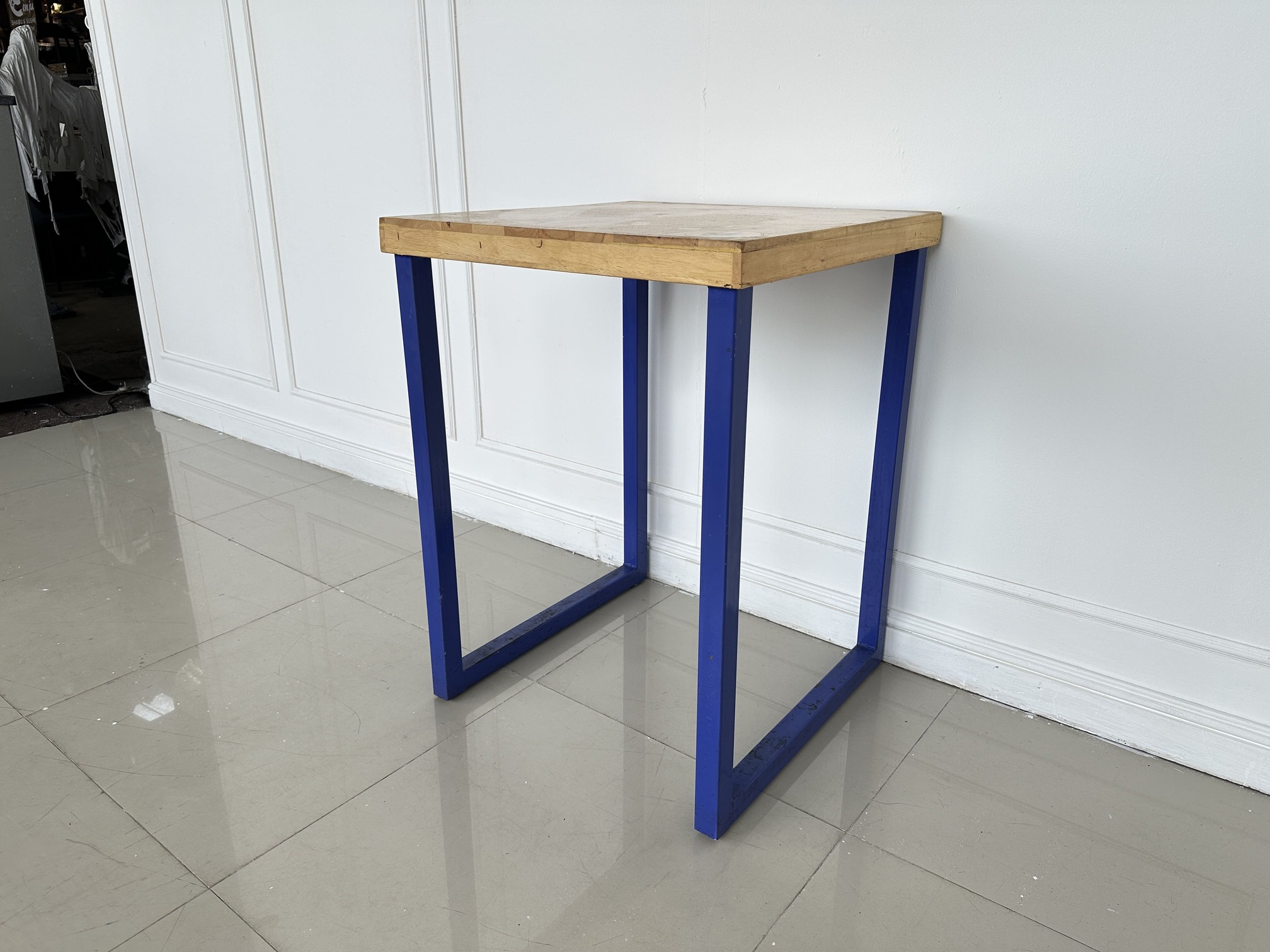 โต๊ะทานอาหาร ท็อปไม้สนประสาน โครงขาเหล็กสีน้ำเงิน