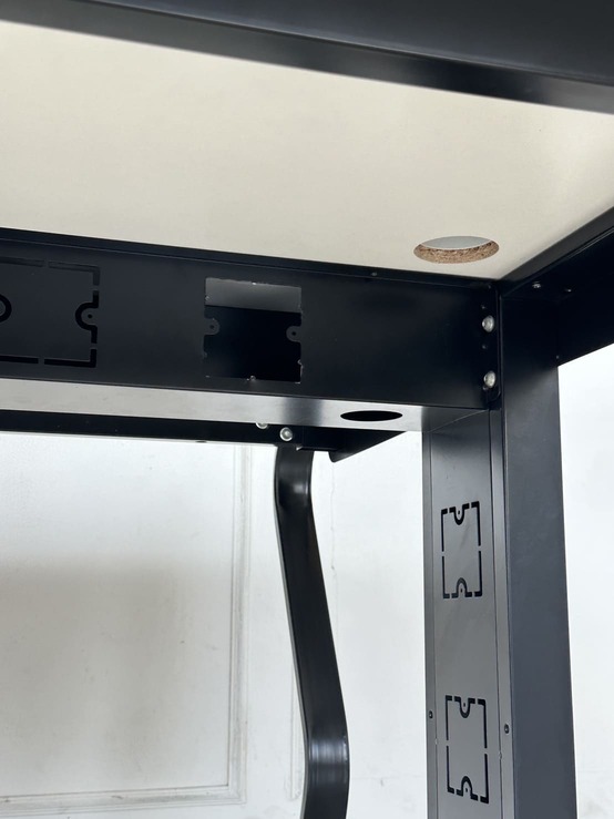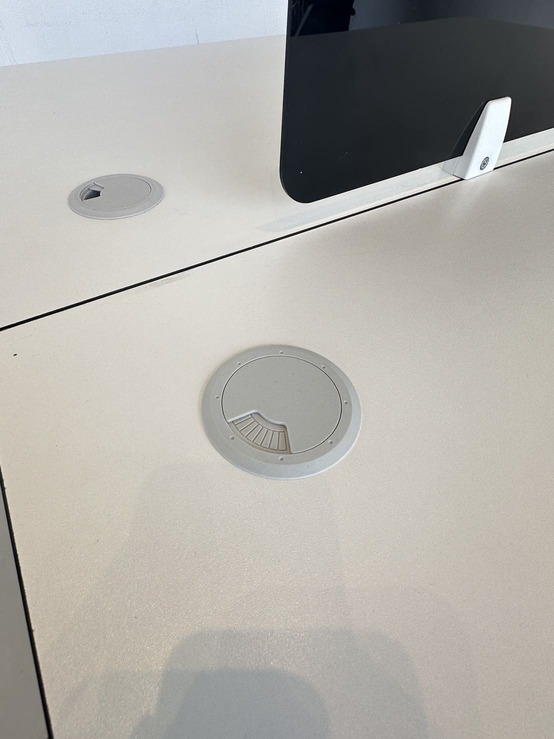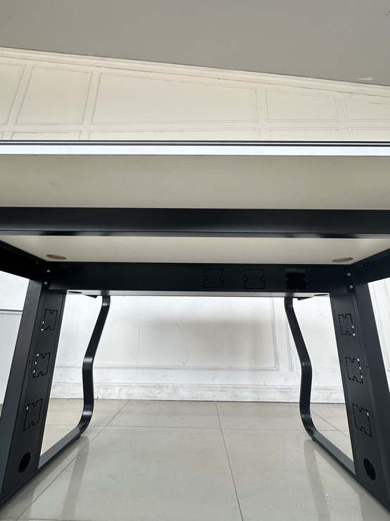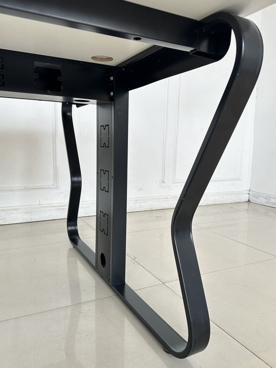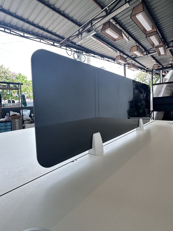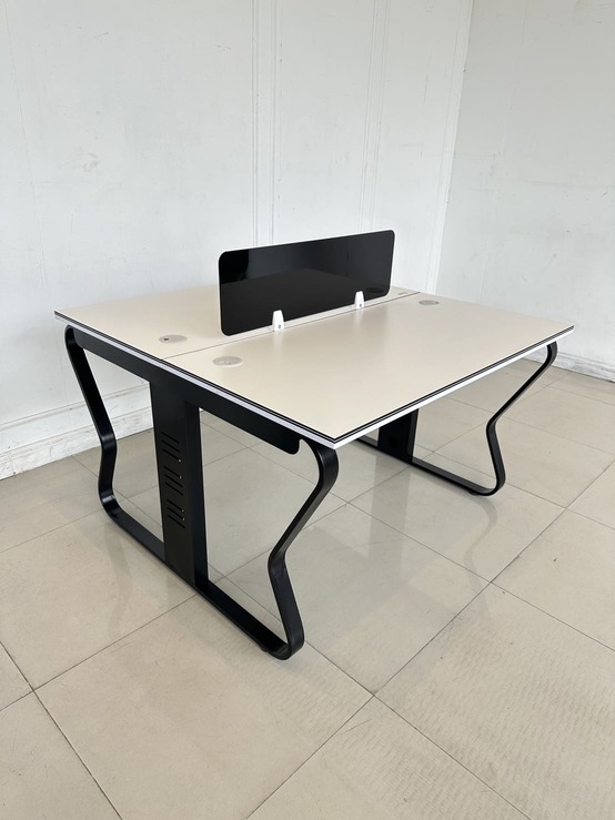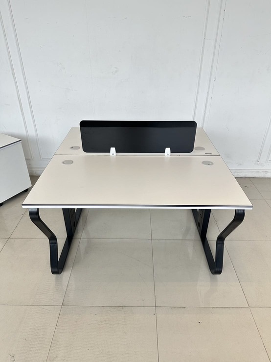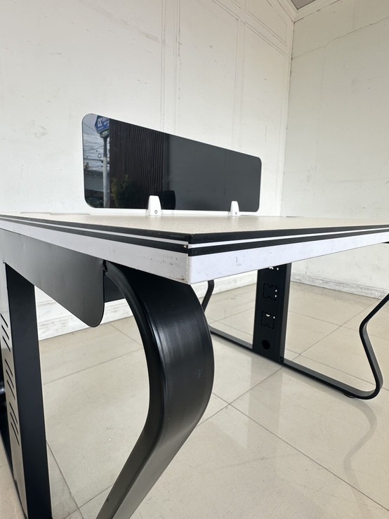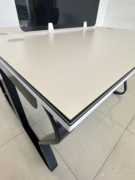 โต๊ะทำงานคู่ (หน้าชนกัน) ท็อปไม้ MDF สีขาว พาติชั่นสีดำ ใต้ท็อปมีรางปลั๊ก โครงขาและรางปลั๊กเหล็กสีดำ