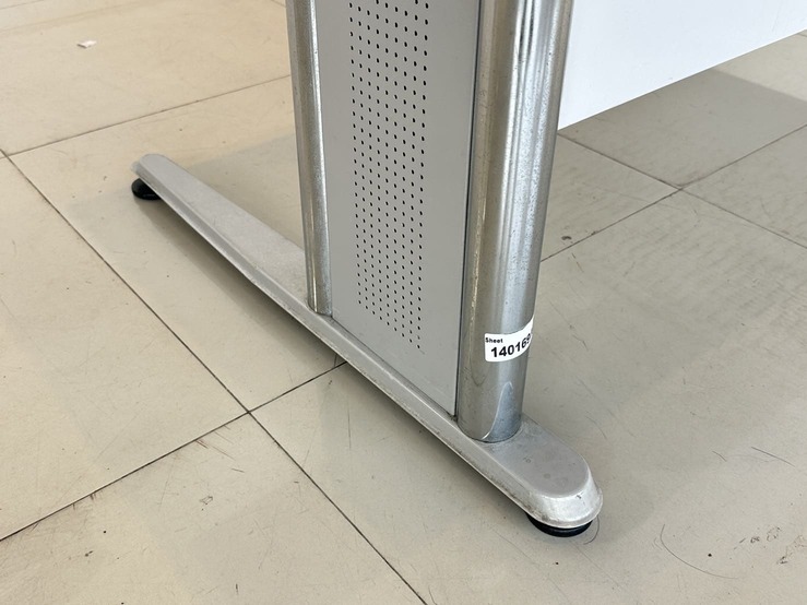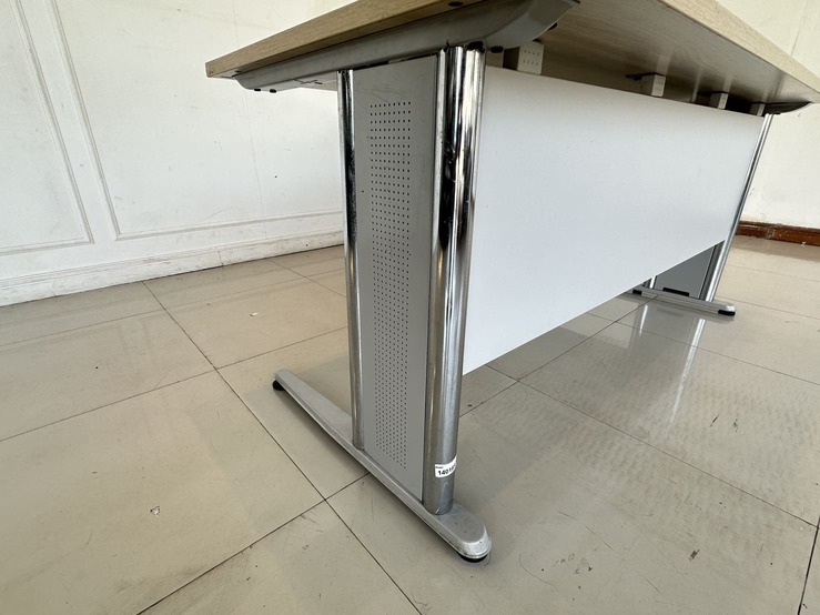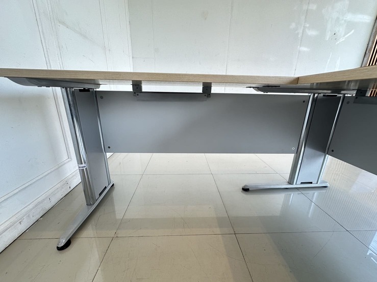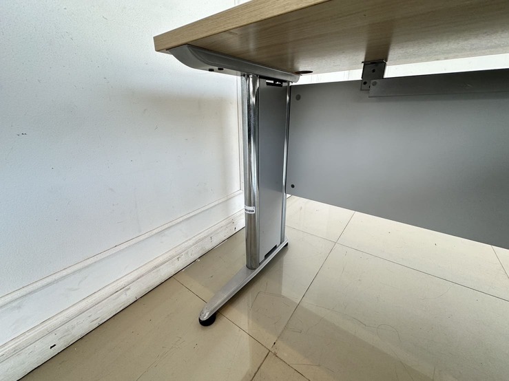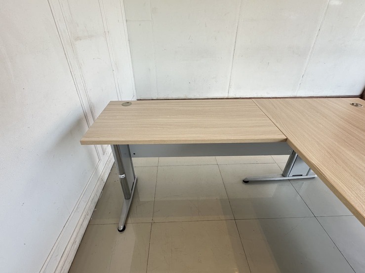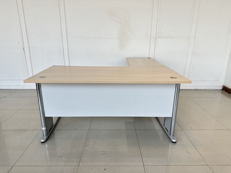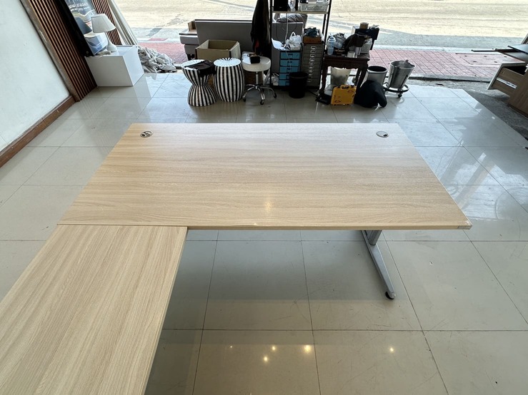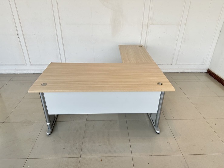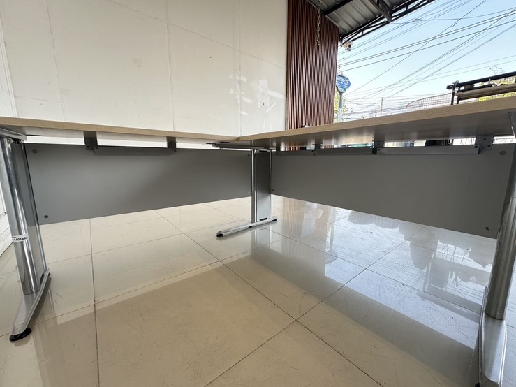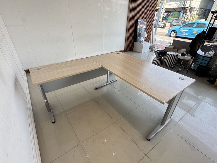 โต๊ะทำงานทรงแอล ท็อปไม้ MDF สีบีชลายไม้ มีรูร้อยสาย 3 มุม โครงขาเหล็ก