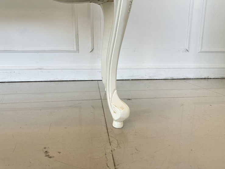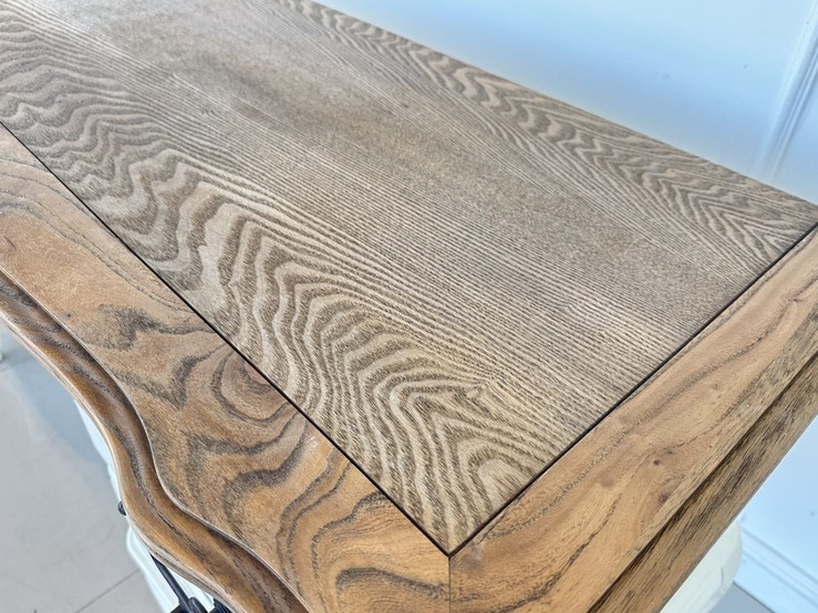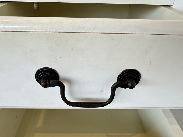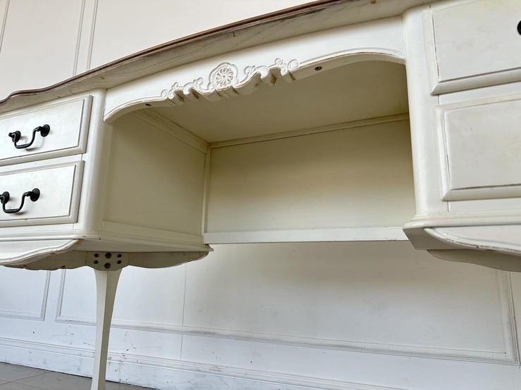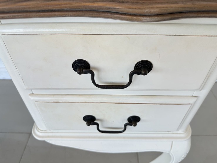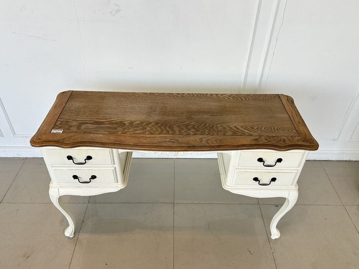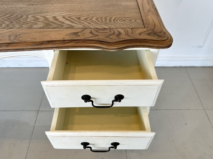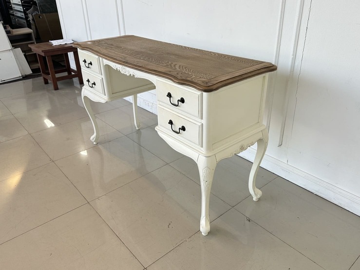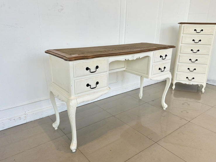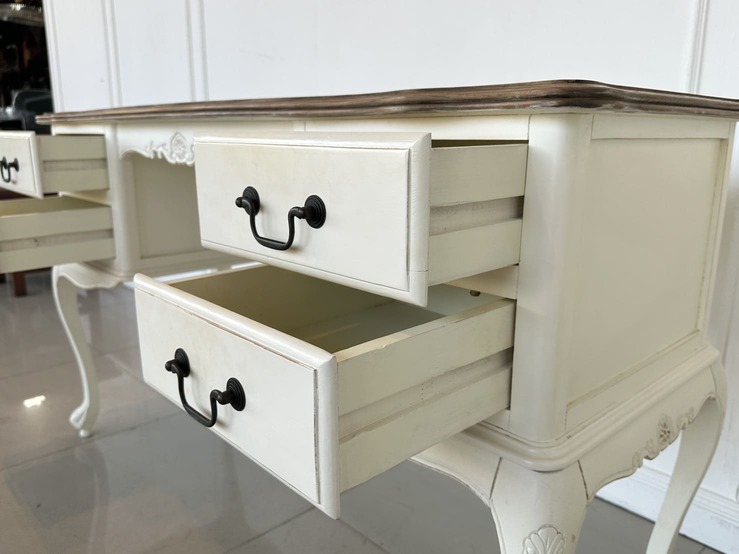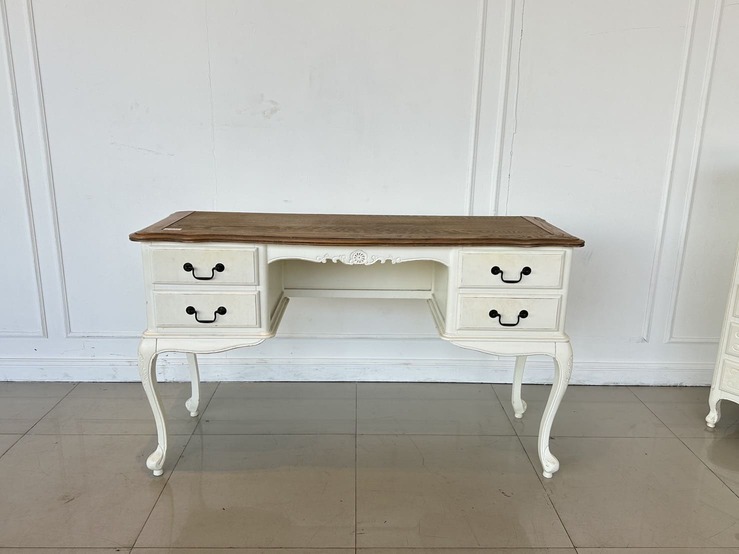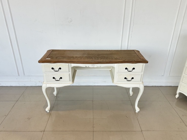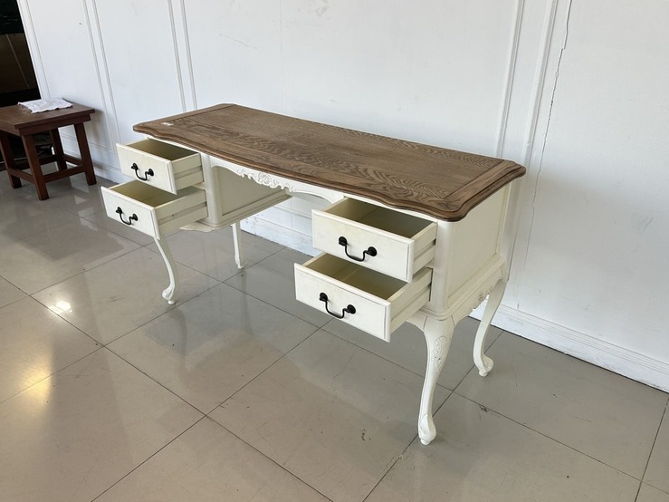โต๊ะทำงาน 4 ลิ้นชัก ท็อปไม้ MDF ผิวลายไม้สีน้ำตาล มือจับอลูมิเนียม โครงขาไม้จริงสีขาว