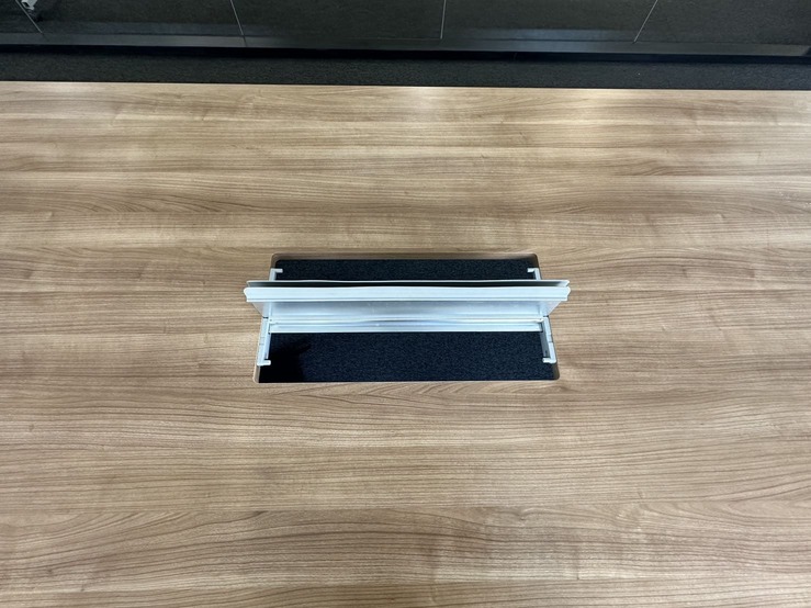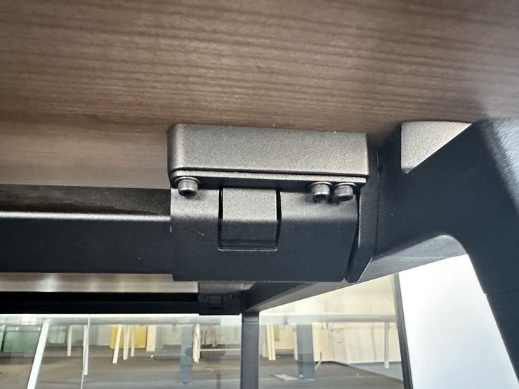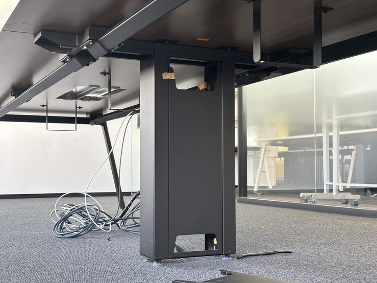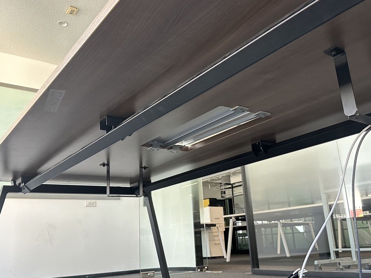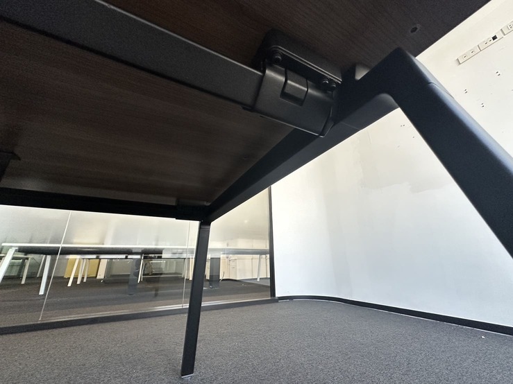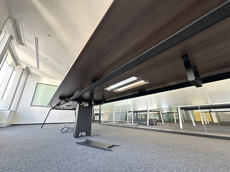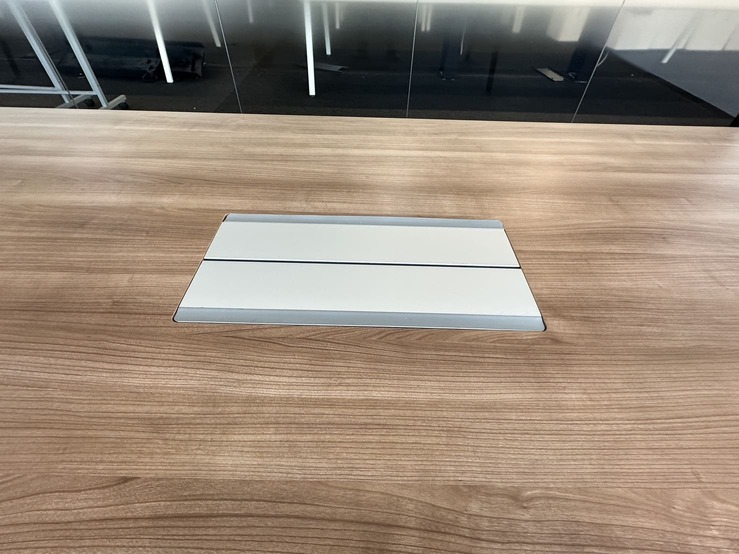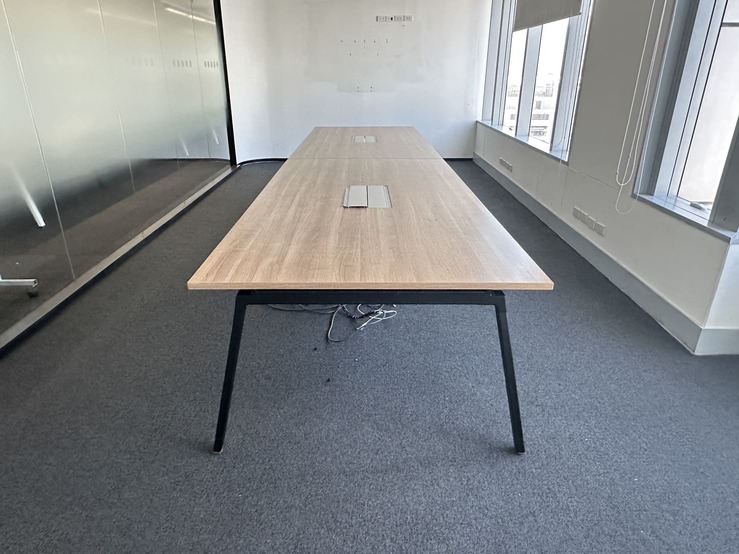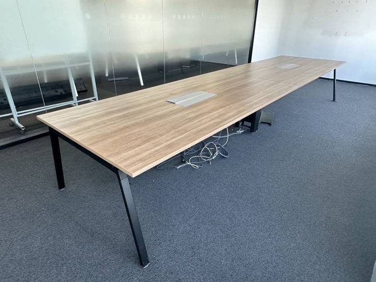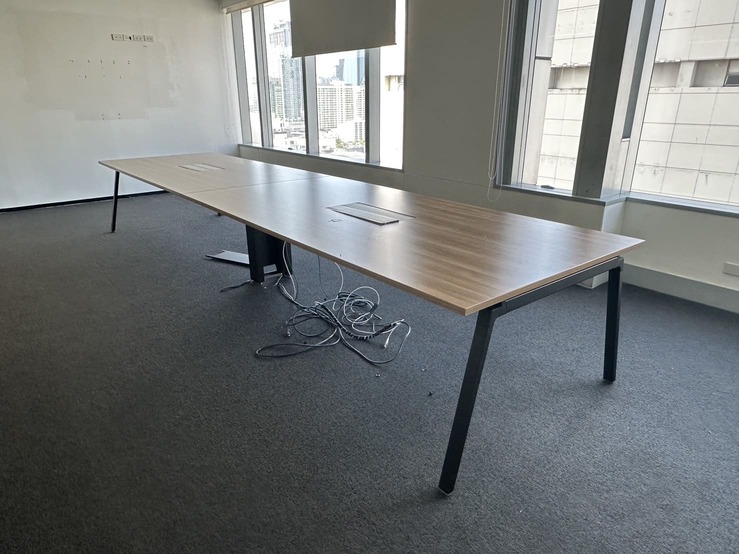 โต๊ะประชุม 10-12 ที่นั่ง แบรนด์ KOKUYO ท็อปไม้อัดสีน้ำตาล ลายไม้ กลางท็อปมีช่องรางปลั๊ก โครงขาเหล็กสีดำ