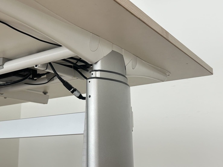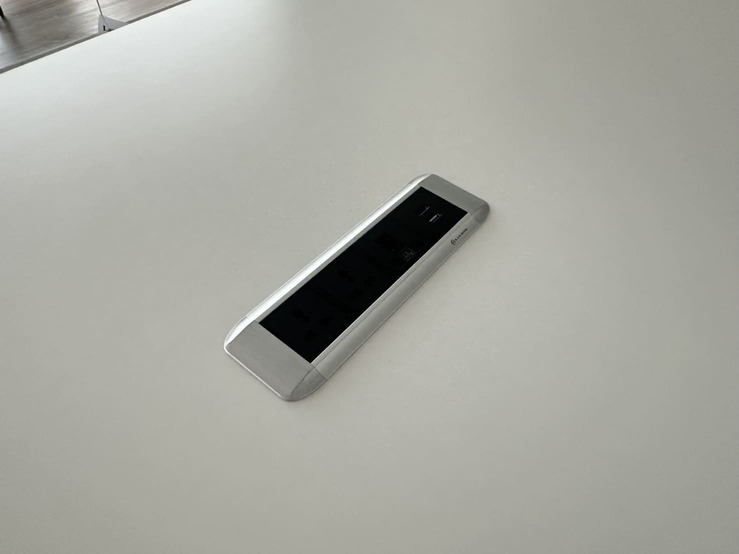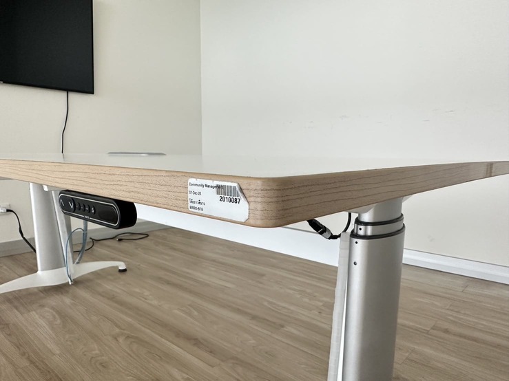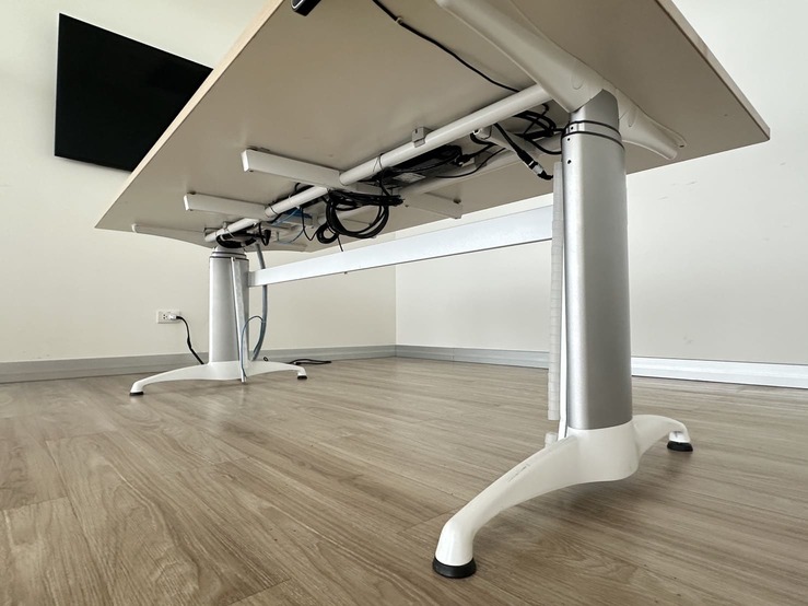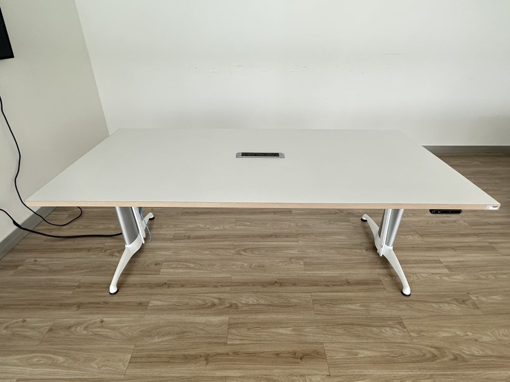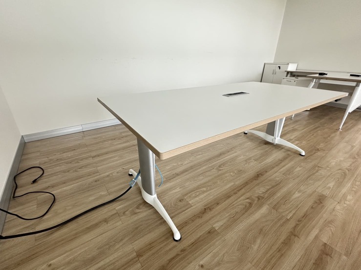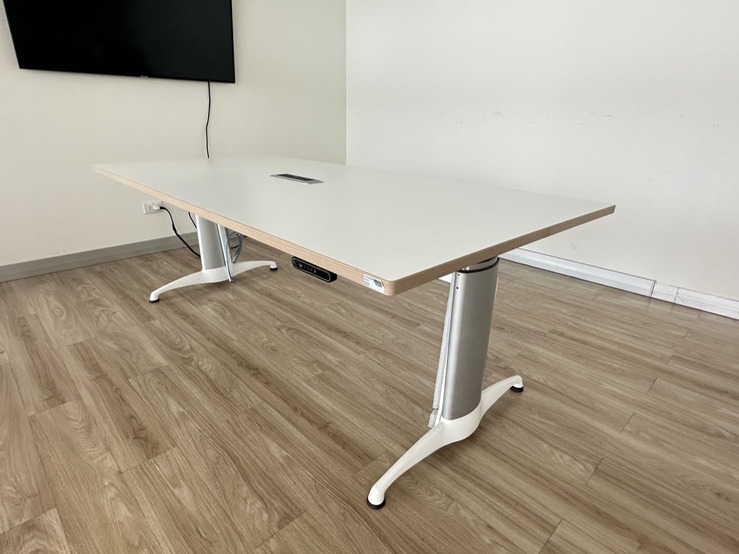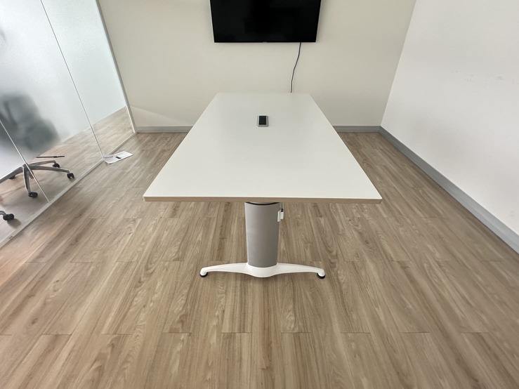 โต๊ะประชุม 4-6 ที่นั่ง ท็อปปรับระดับขึ้นลงได้ด้วยระบบไฟฟ้า โครงขาเหล็กสีเงินสลับขาว