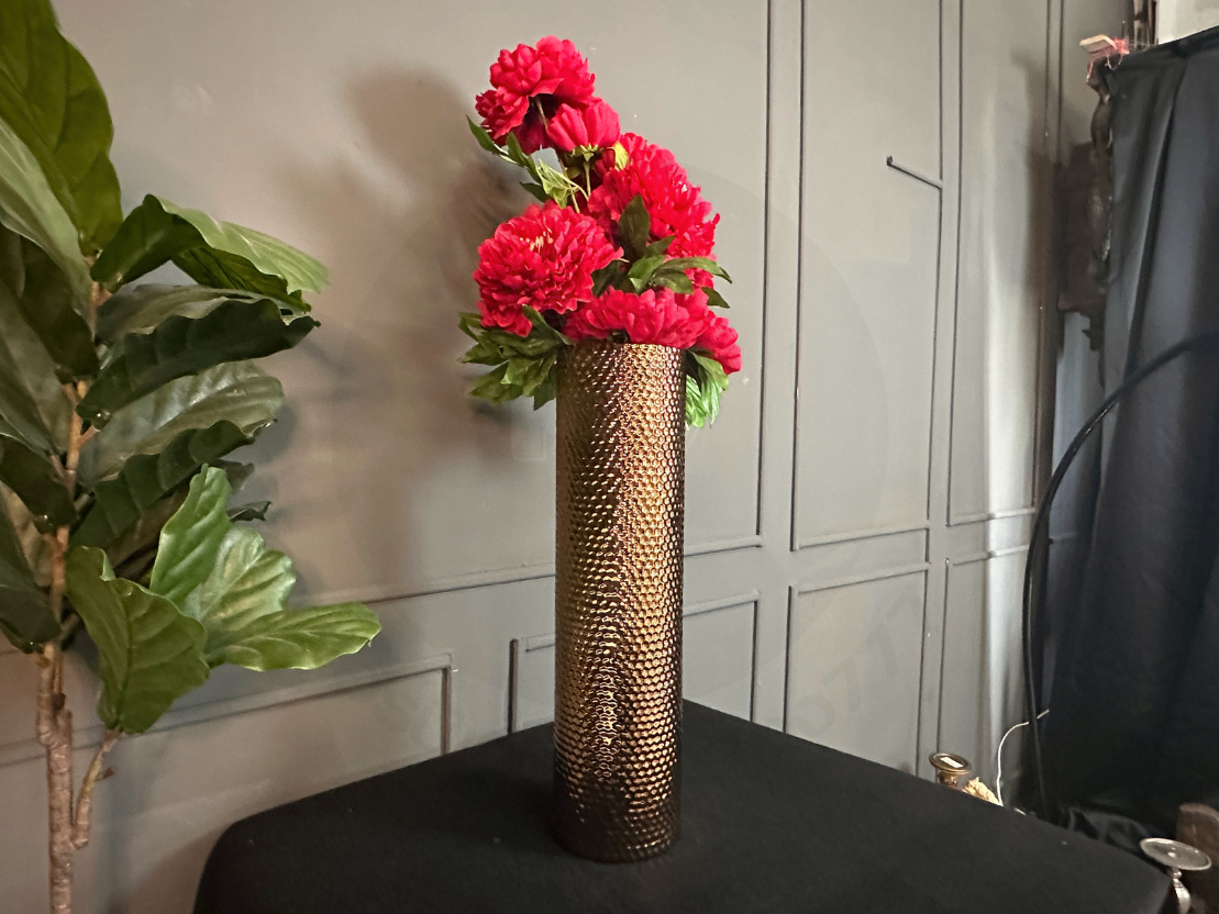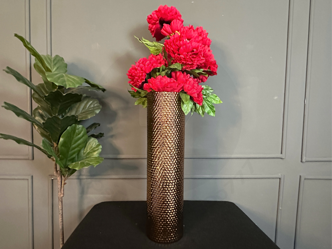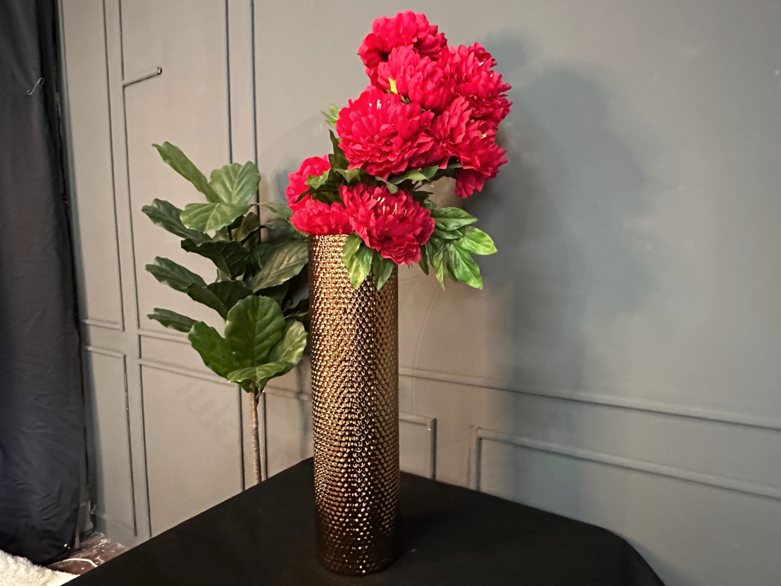 แจกันเซรามิกทรงกระบอกสูงสีทองแดง พร้อมดอกไม้ปลอมสีแดง