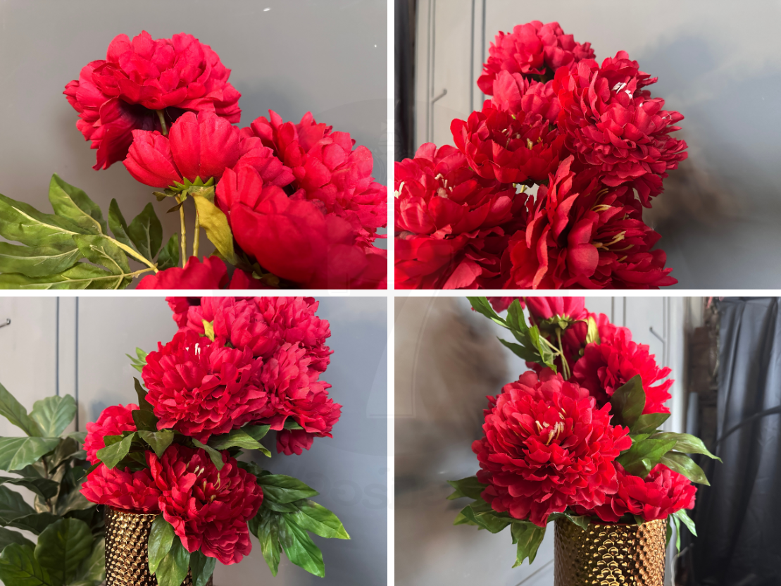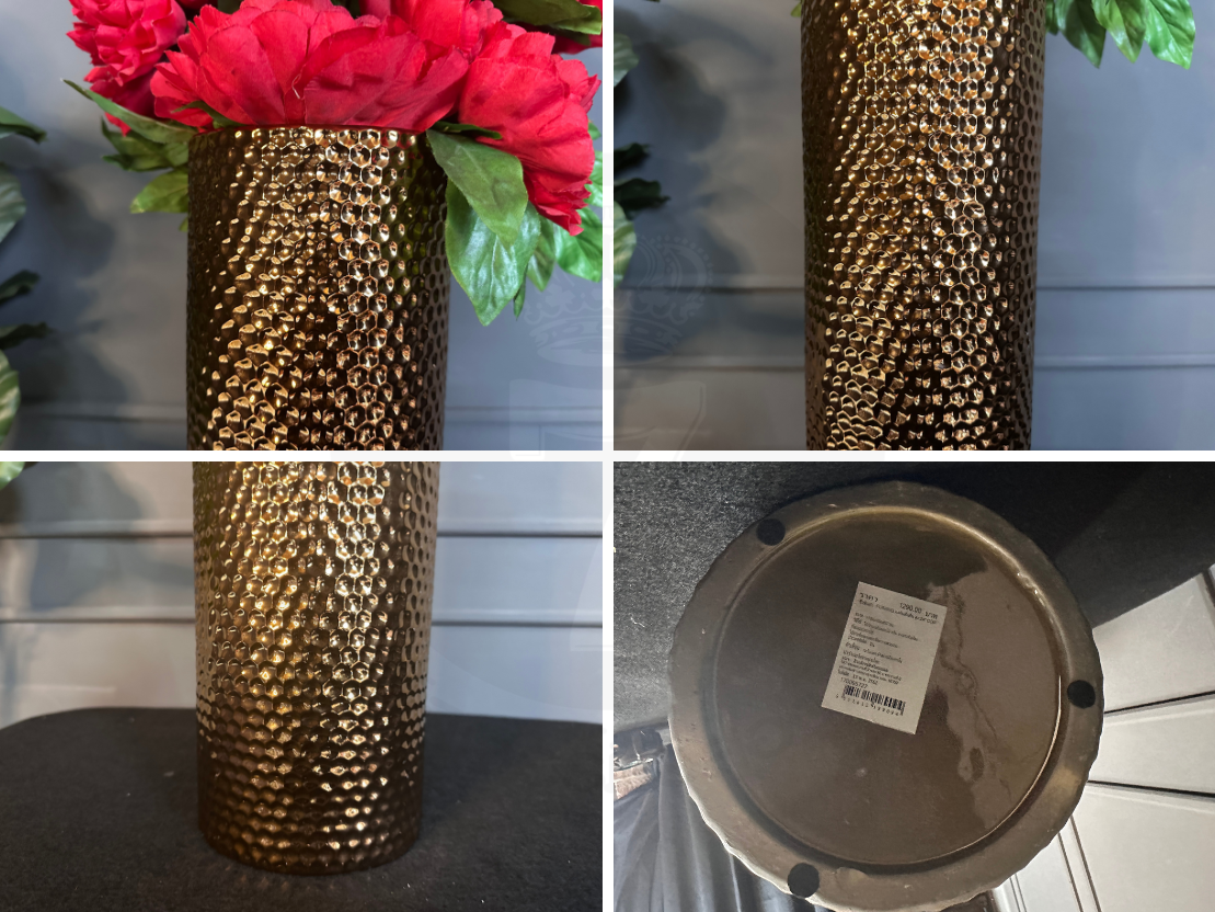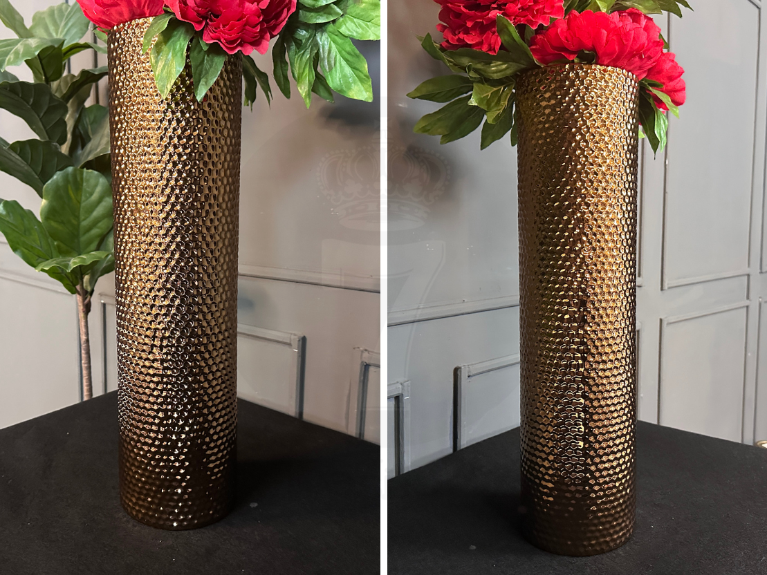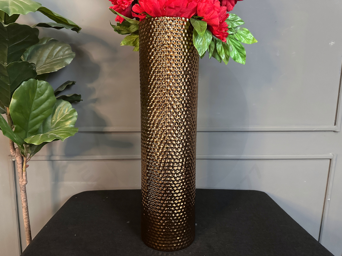 แจกันเซรามิกทรงกระบอกสูงสีทองแดง พร้อมดอกไม้ปลอมสีแดง