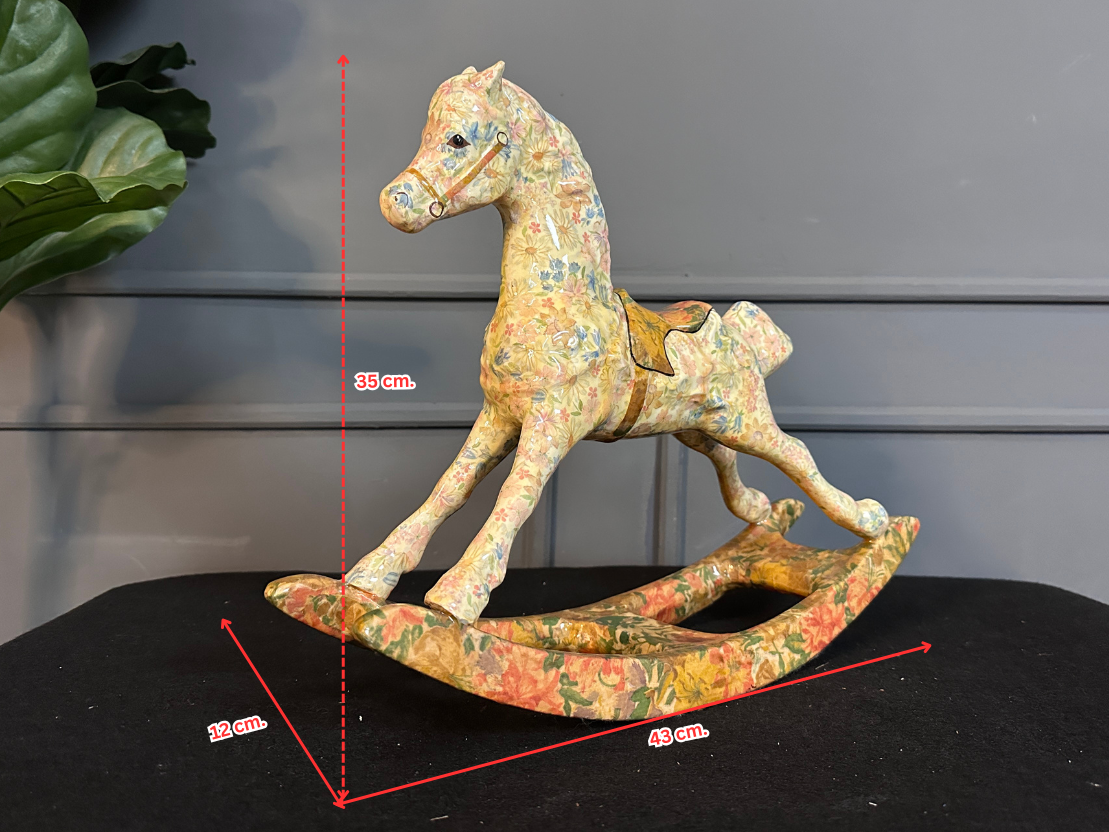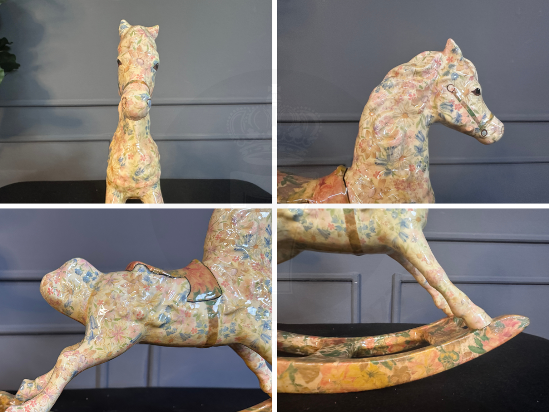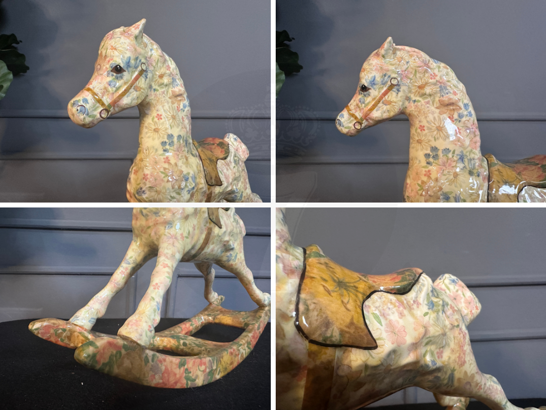 รูปปั้นม้าโยกเซรามิกลายดอกไม้ (มีรอยเหลืองรอบรอบตามภาพ)