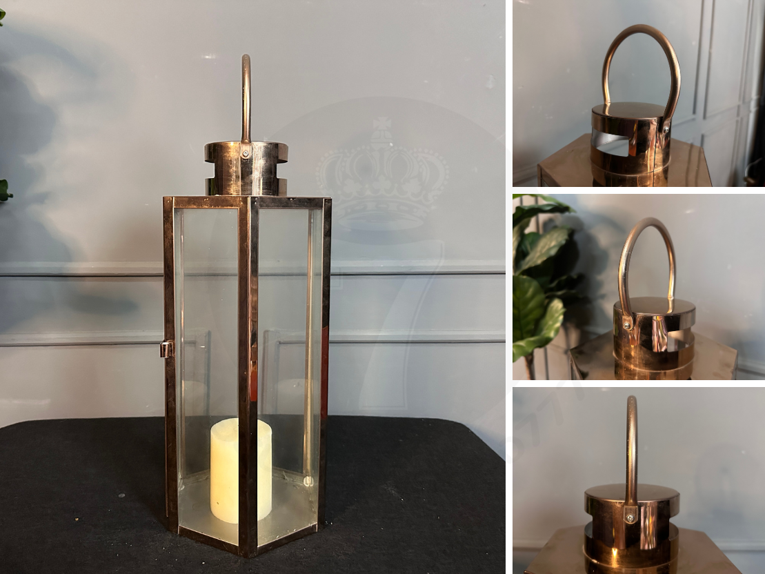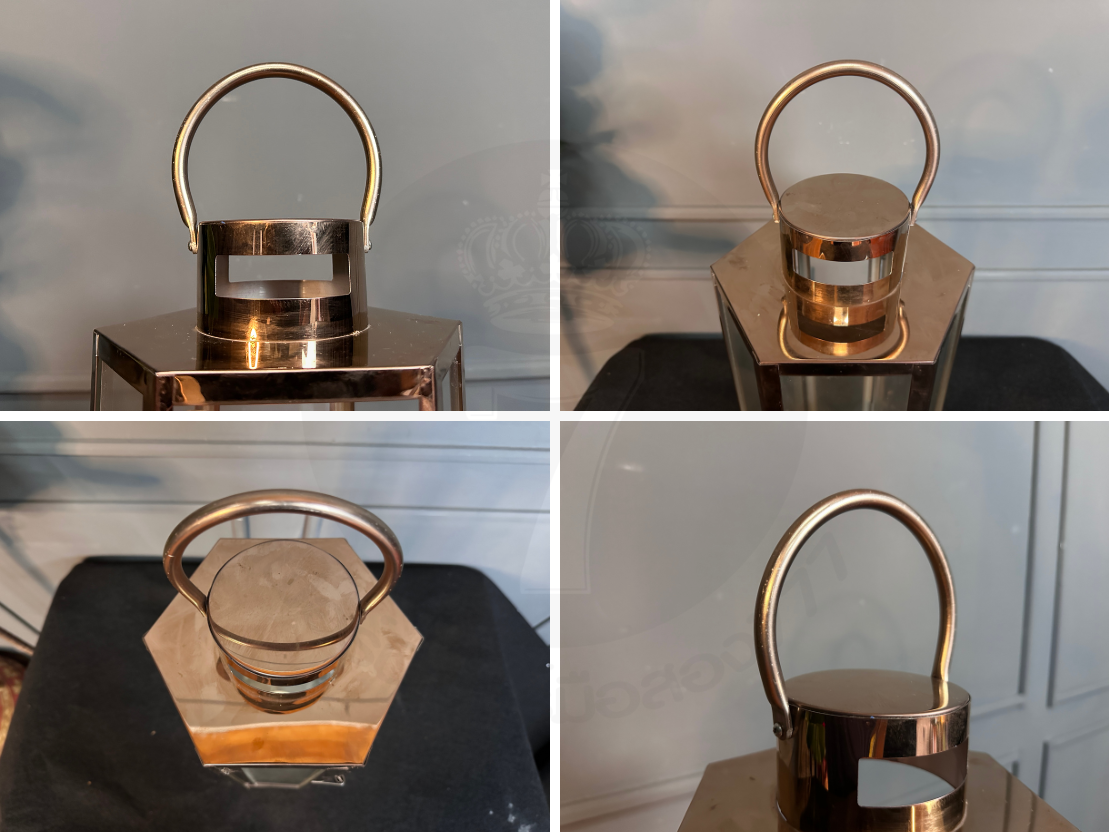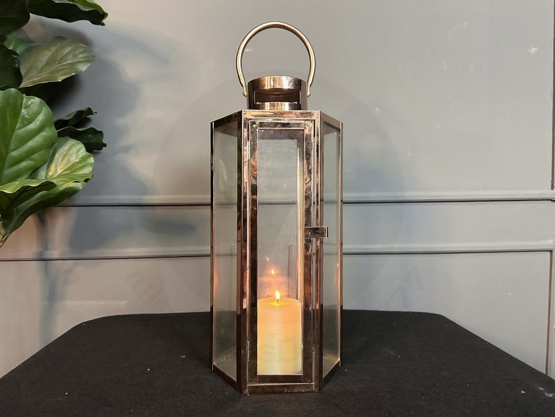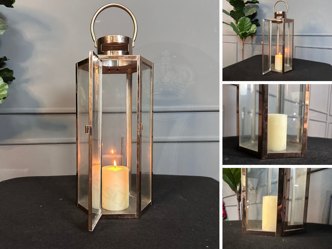 ตะเกียงทรงหกเหลี่ยม โป๊ะกระจกใส โครงสแตนเลสสีโรสโกลด์ (มีรายรับรอบตามภาพและไม่รวมเทียน)