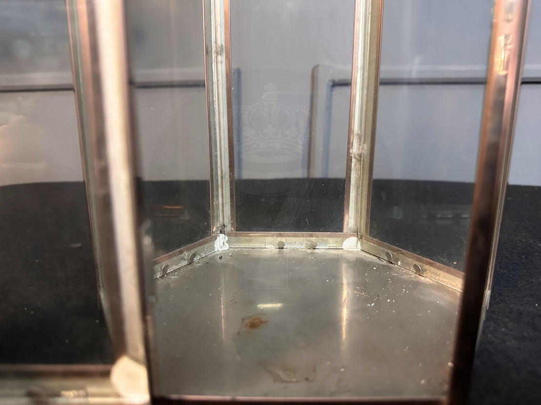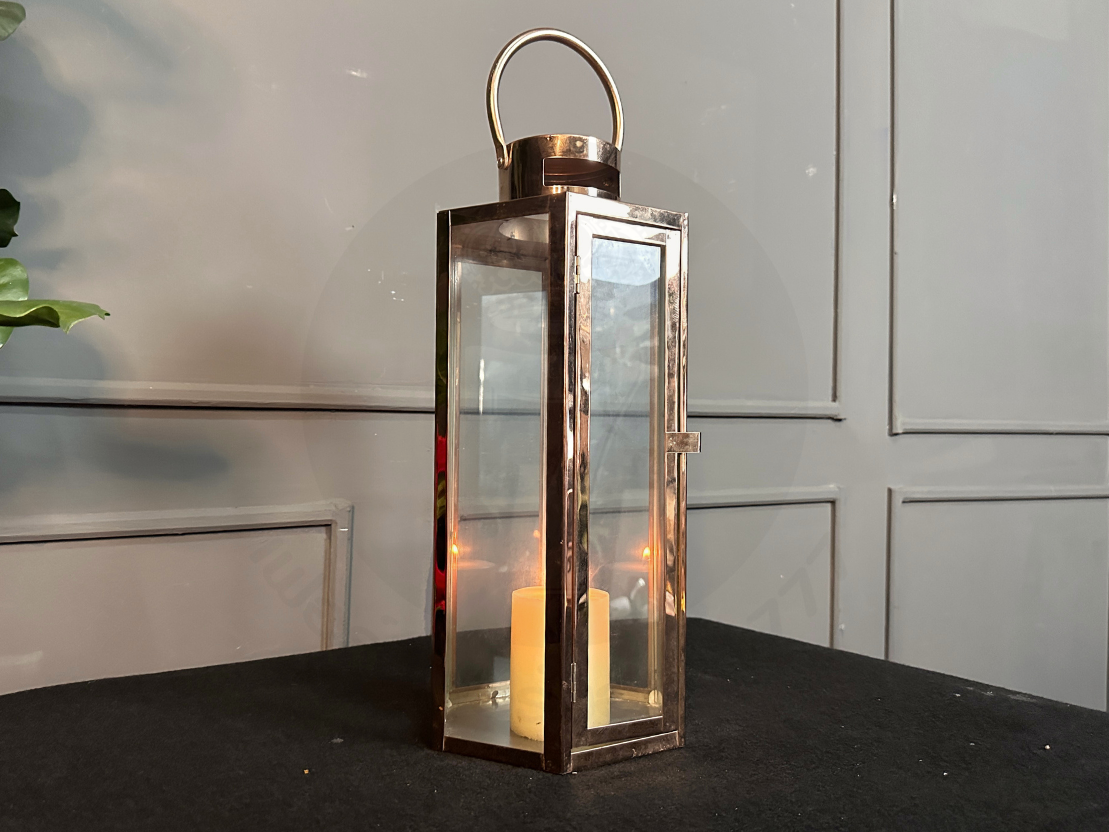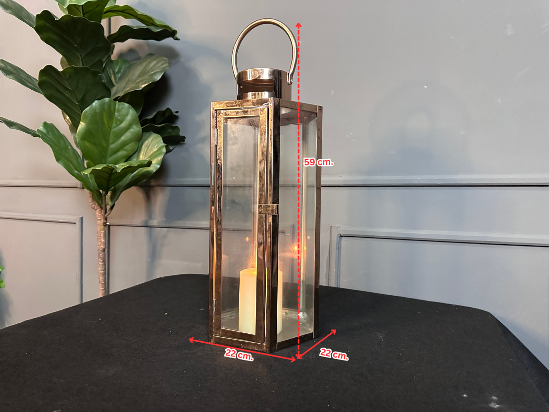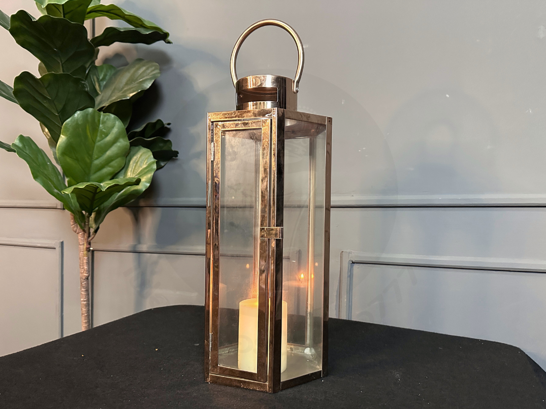 ตะเกียงทรงหกเหลี่ยม โป๊ะกระจกใส โครงสแตนเลสสีโรสโกลด์ (มีรายรับรอบตามภาพและไม่รวมเทียน)