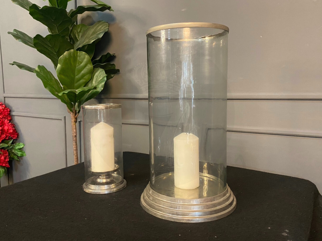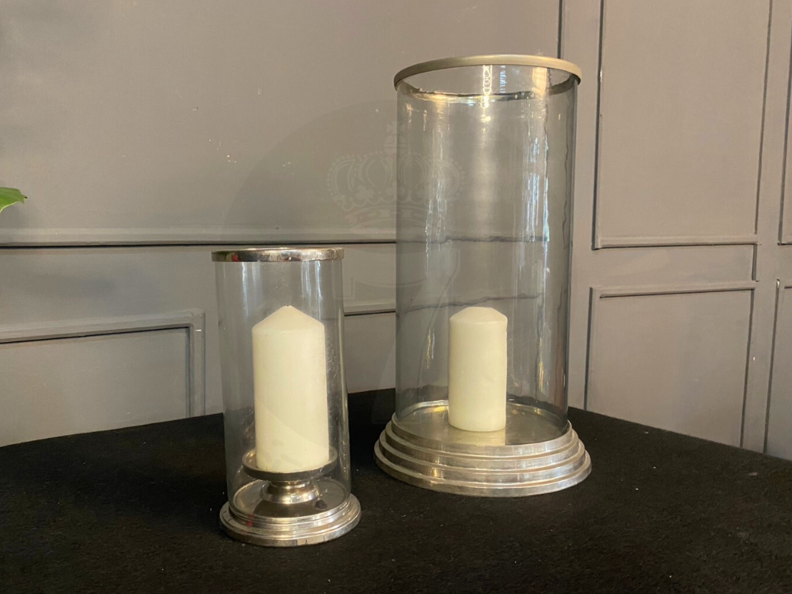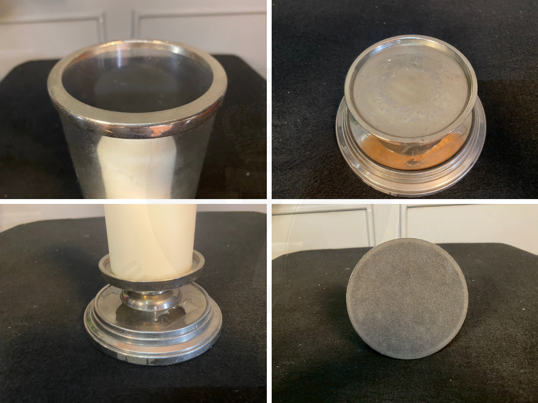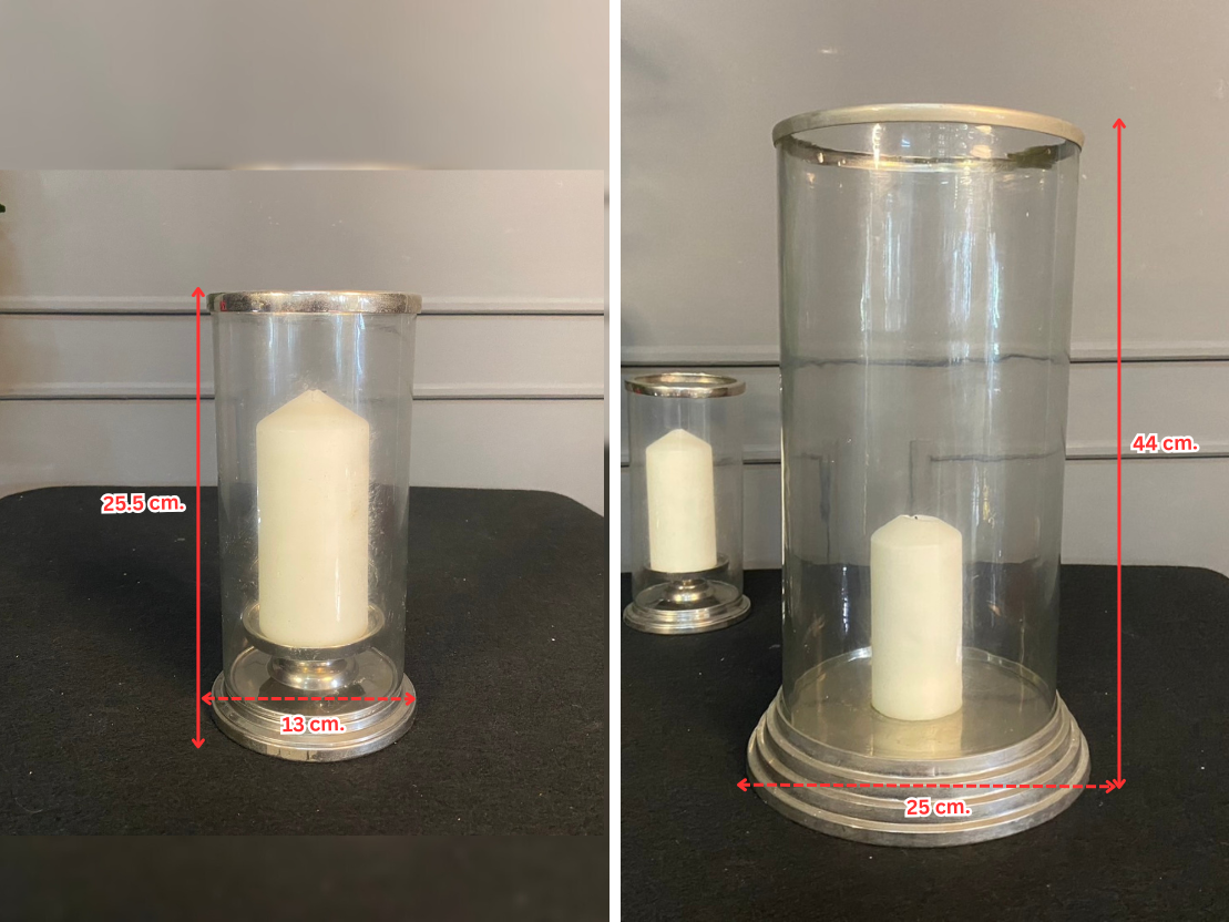 เชิงเทียนโป๊ะแก้วฐานสแตนเลสสีเงิน 2 ขนาด (มีตำหนิตามภาพและไม่รวมเทียน)