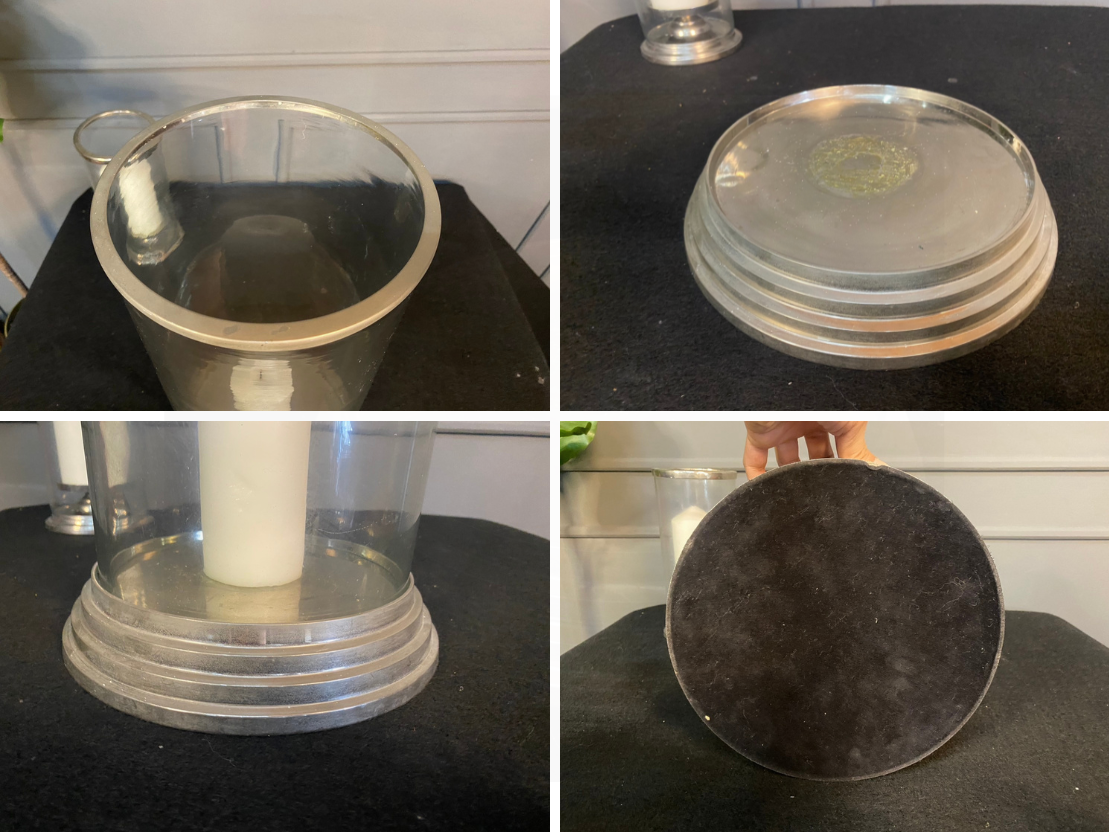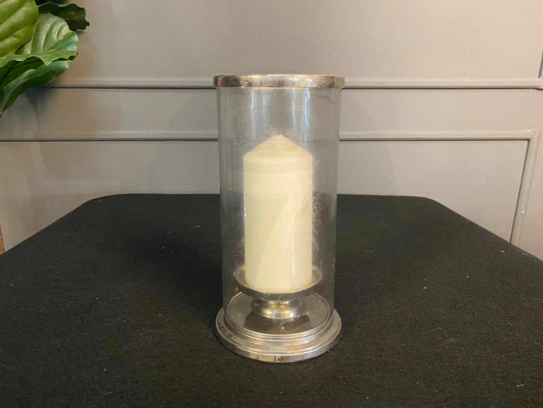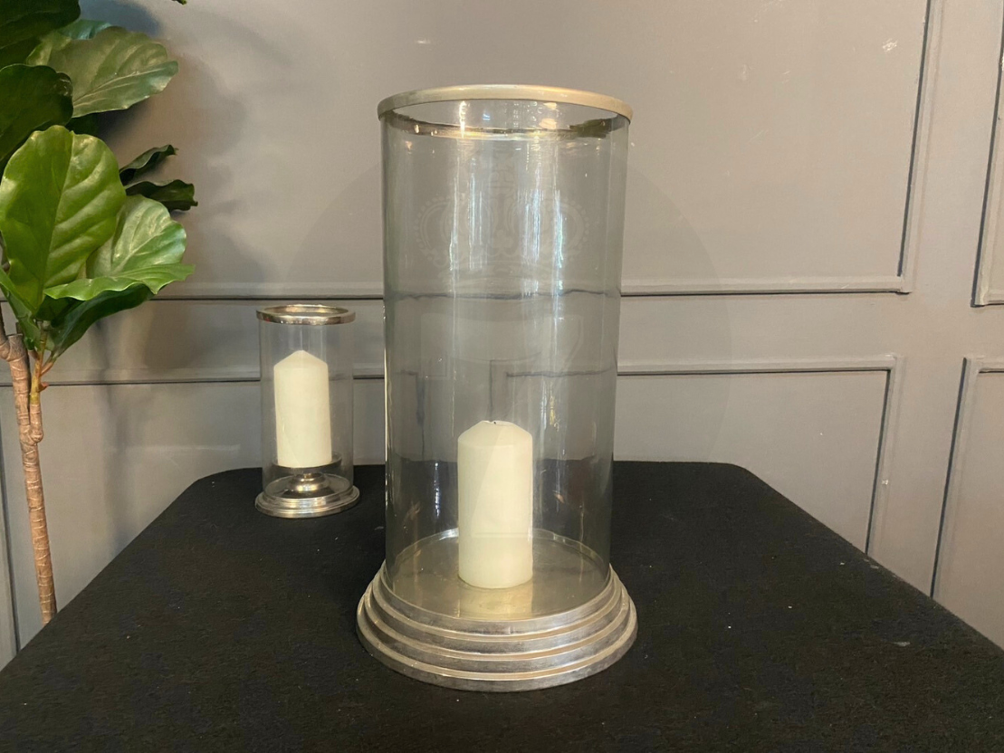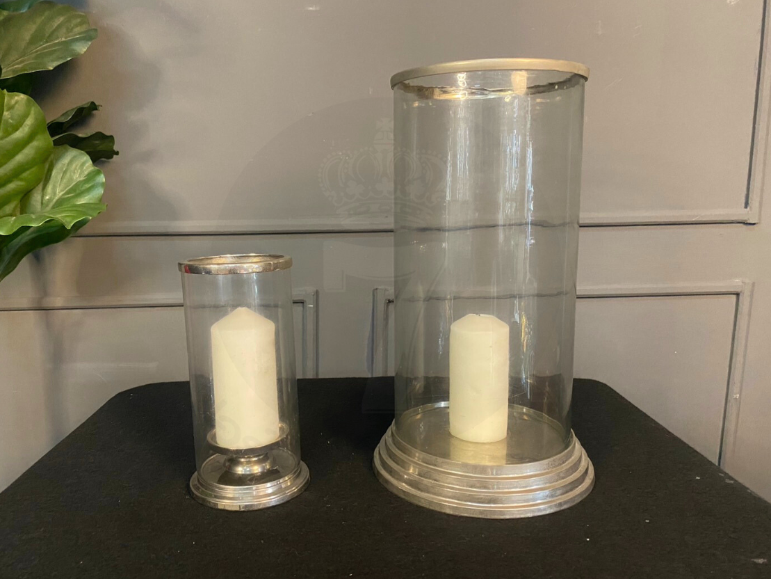 เชิงเทียนโป๊ะแก้วฐานสแตนเลสสีเงิน 2 ขนาด (มีตำหนิตามภาพและไม่รวมเทียน)