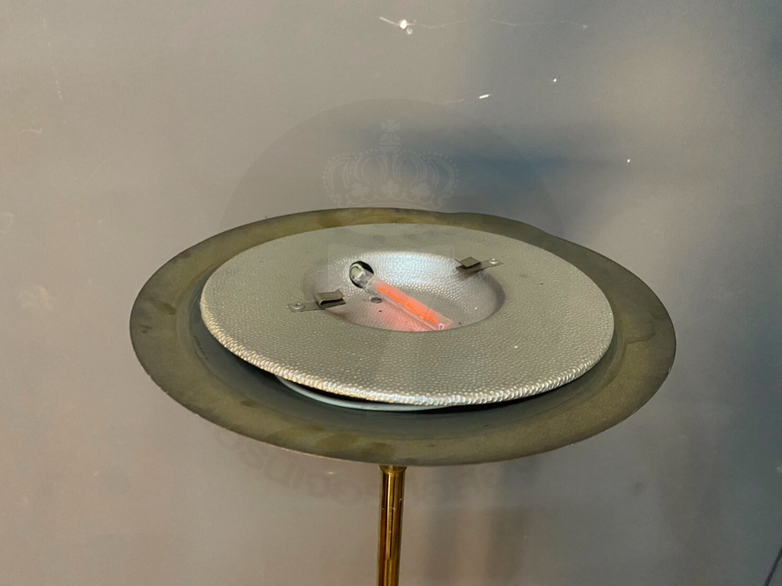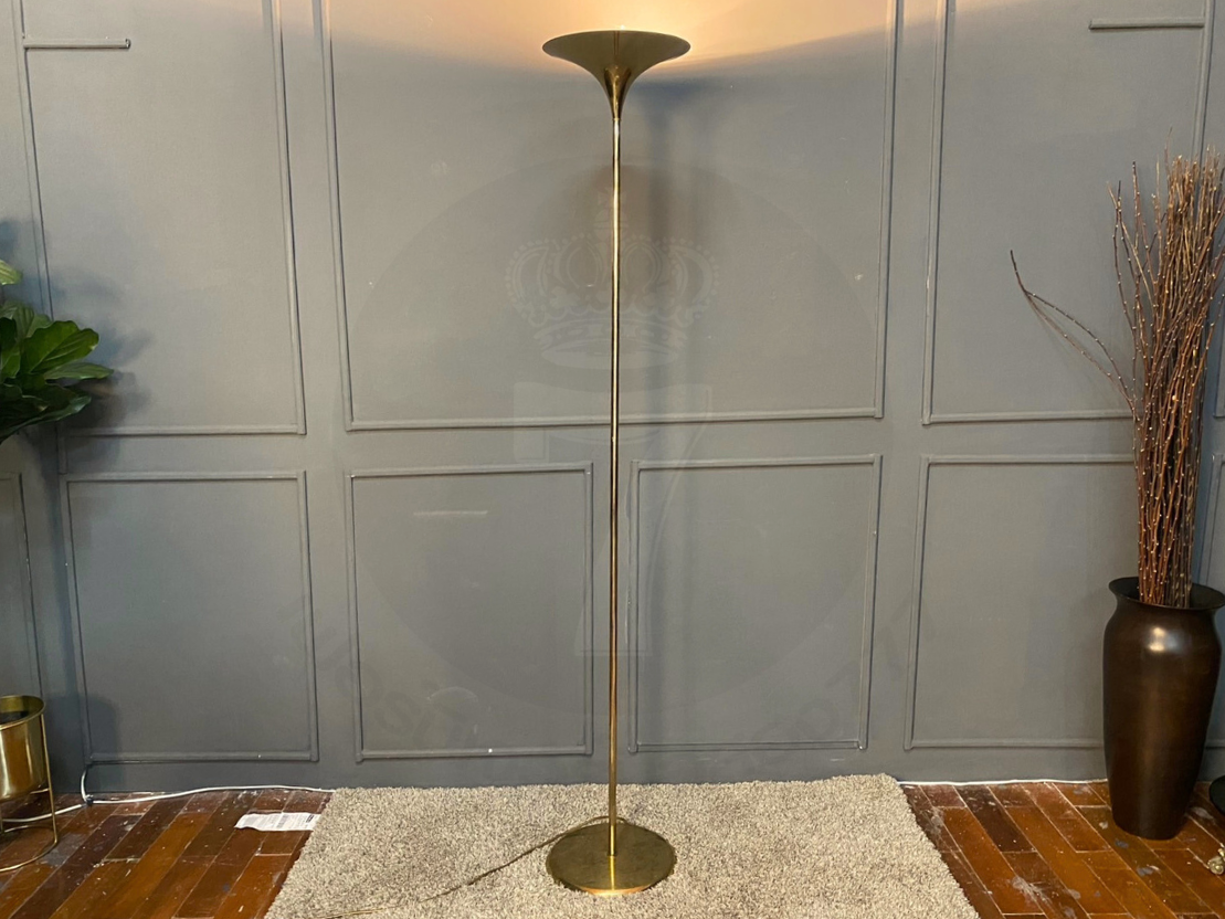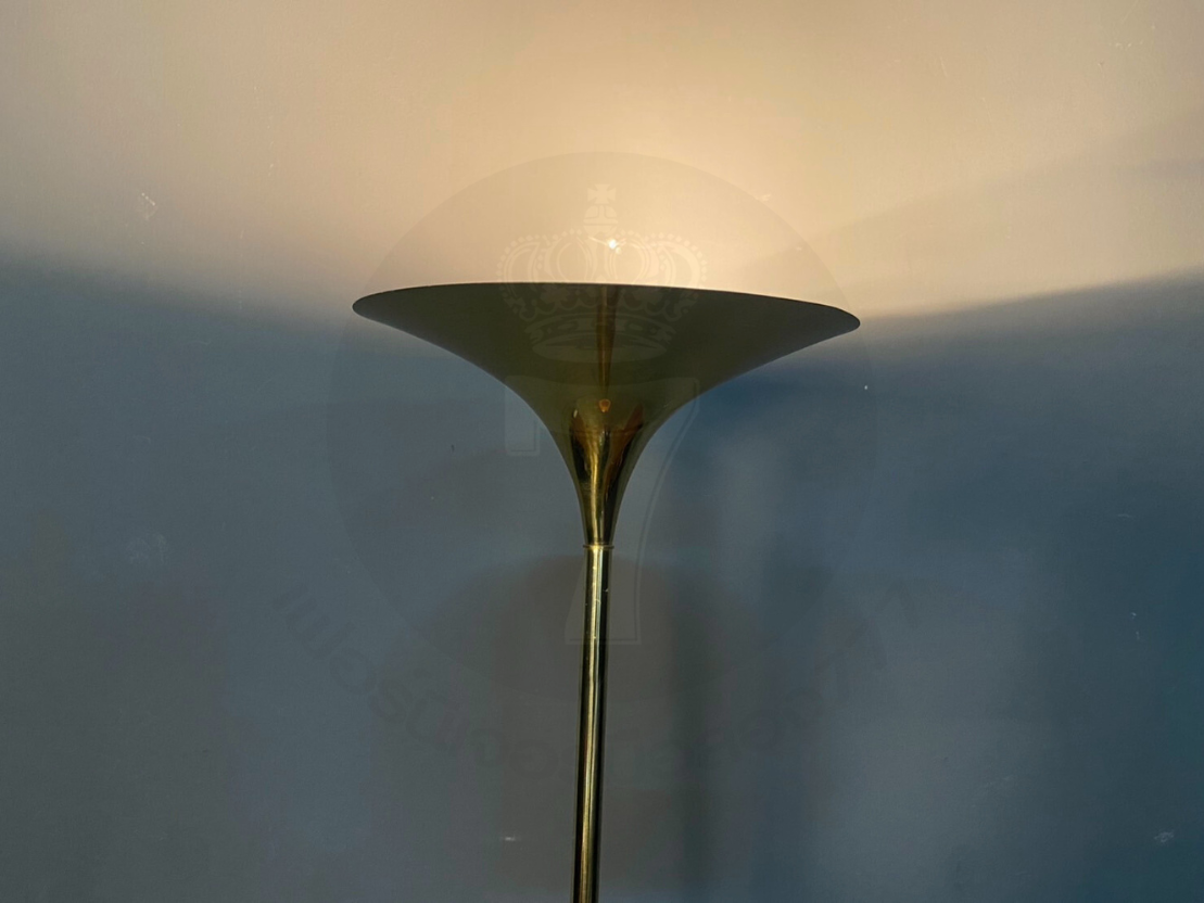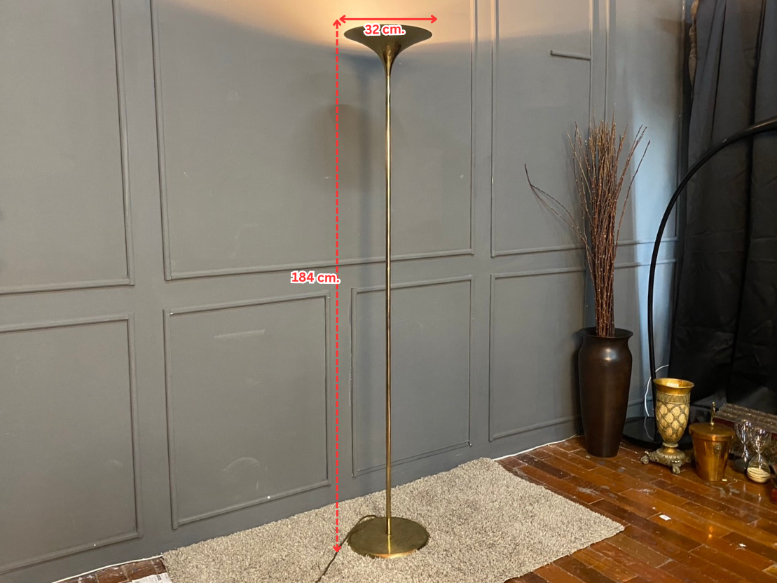 โคมไฟตั้งพื้น สแตนเลสสีทอง ฐานแผ่นเหล็ก ปรับ ความสว่างของไฟได้ (ตำหนิโป๊ะมีรอยบิ่นตามภาพ)