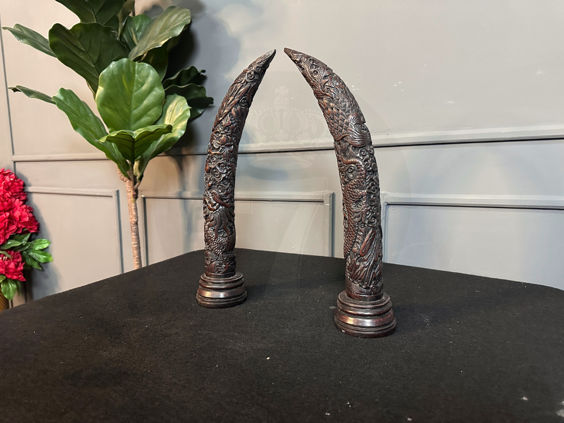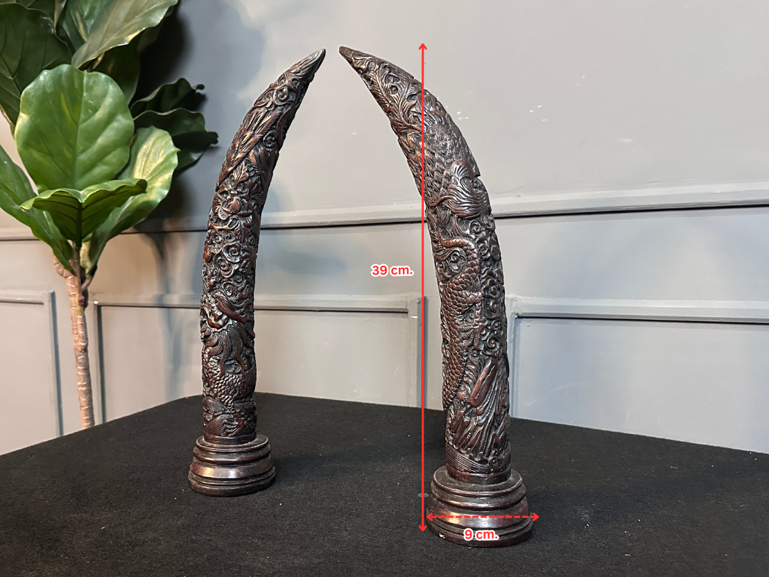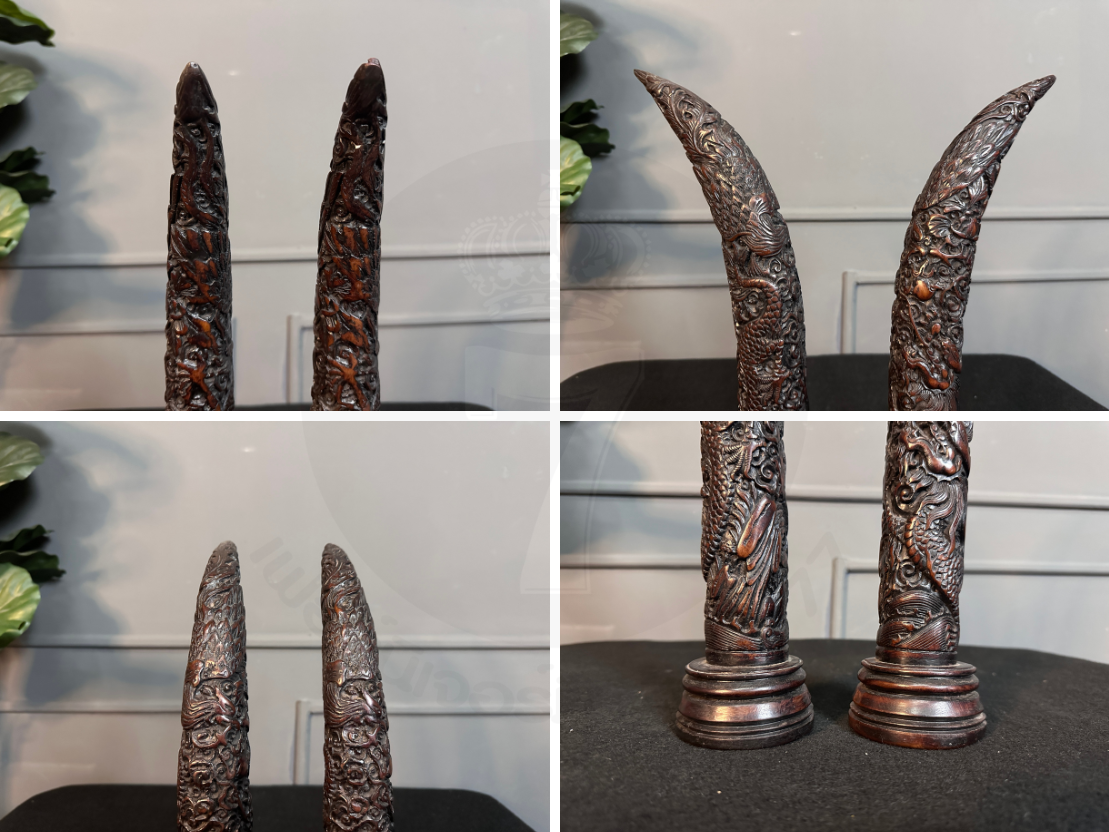 งาช้างเรซิ่นแกะสลักรูปมังกร 1 คู่ (มีรอยแตกตรงปลายงาเล็กน้อย)