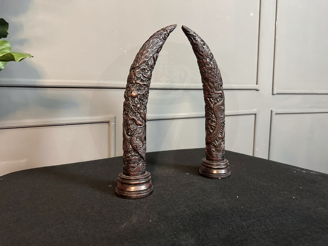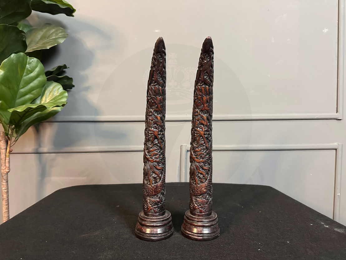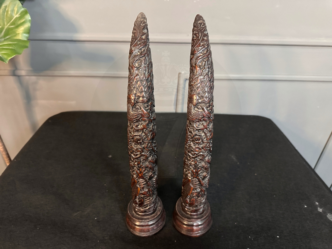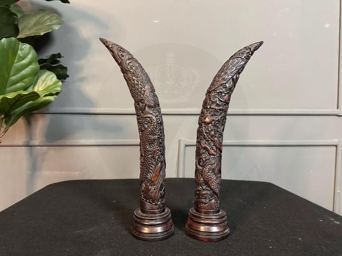 งาช้างเรซิ่นแกะสลักรูปมังกร 1 คู่ (มีรอยแตกตรงปลายงาเล็กน้อย)
